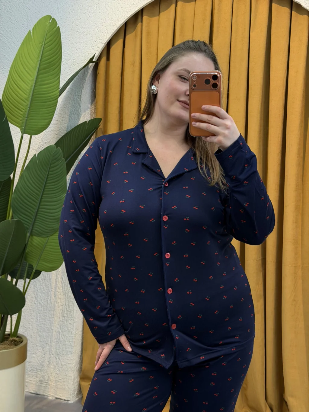 Düğmeli Esnek Pijama Takımı - Lacivert Kiraz Desenli
