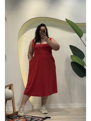 Askılı Kare Yaka Cepli Sandy Elbise - Kırmızı