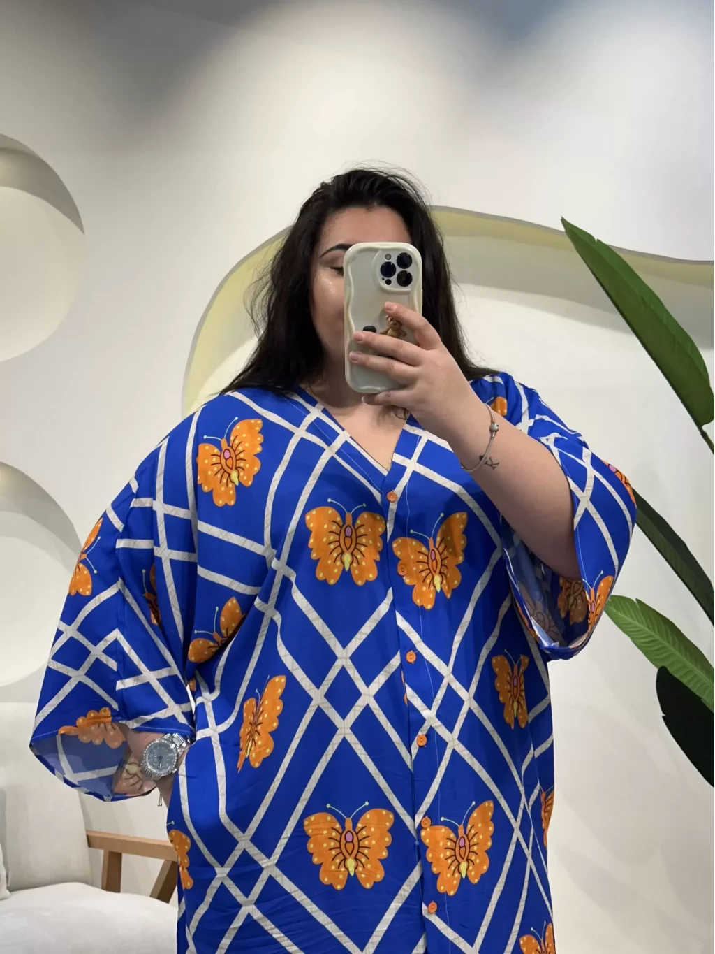 Geniş Kesim Düğme Detaylı Pamuklu Viskon Elbise - Mavi Kelebekli