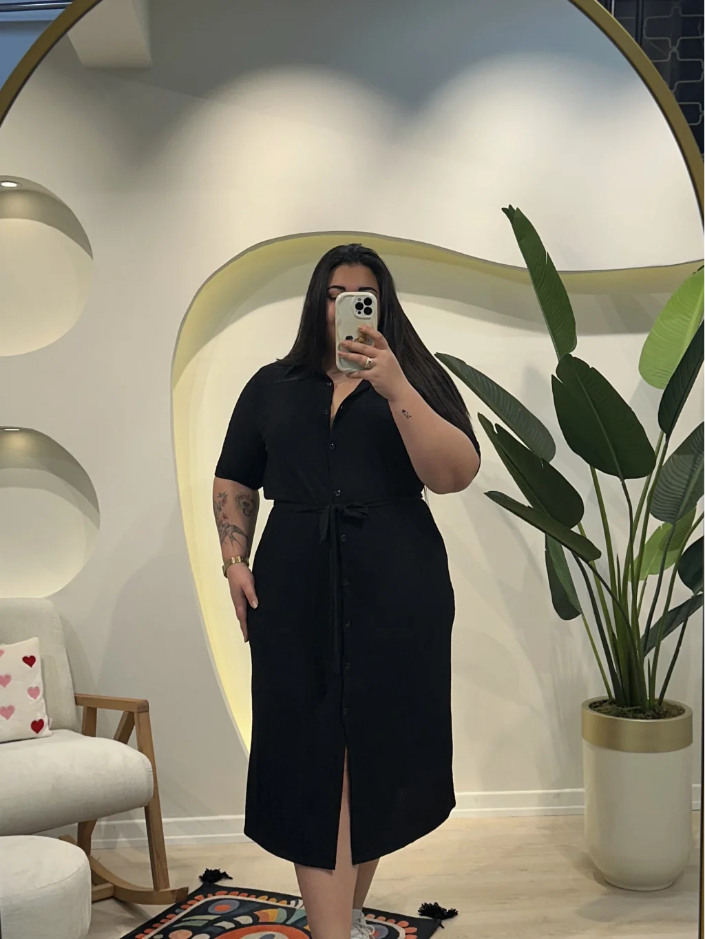 Kuşaklı Esnek Gömlek Elbise - Siyah Krinkle
