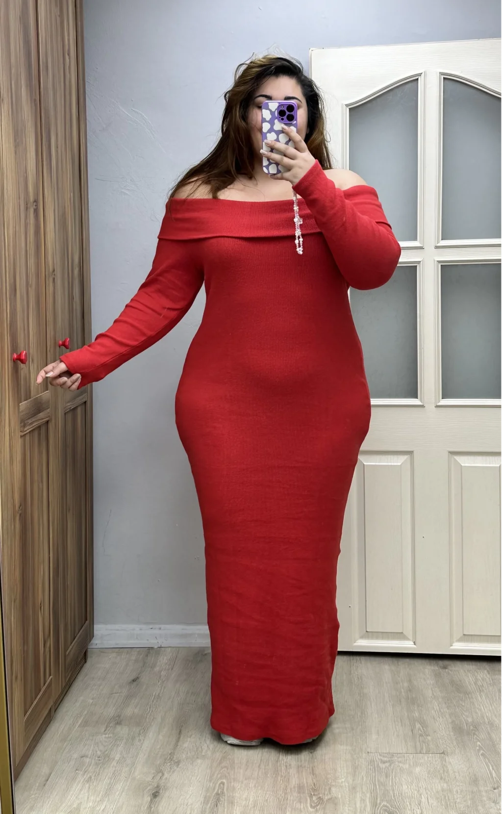 Madonna Yaka Likralı Triko Elbise - Kırmızı