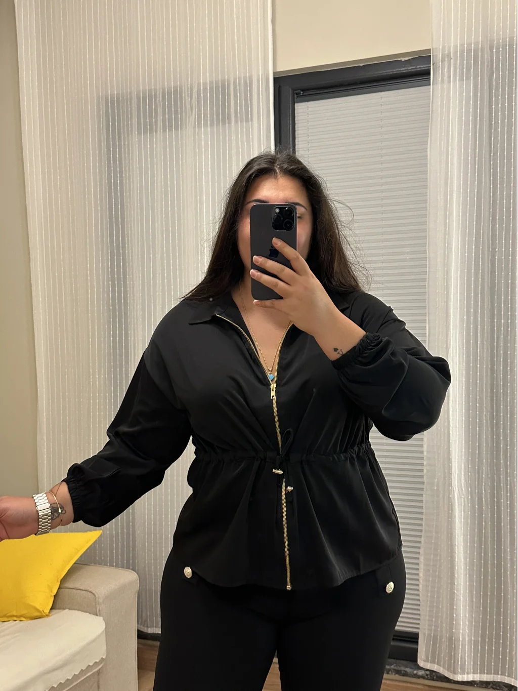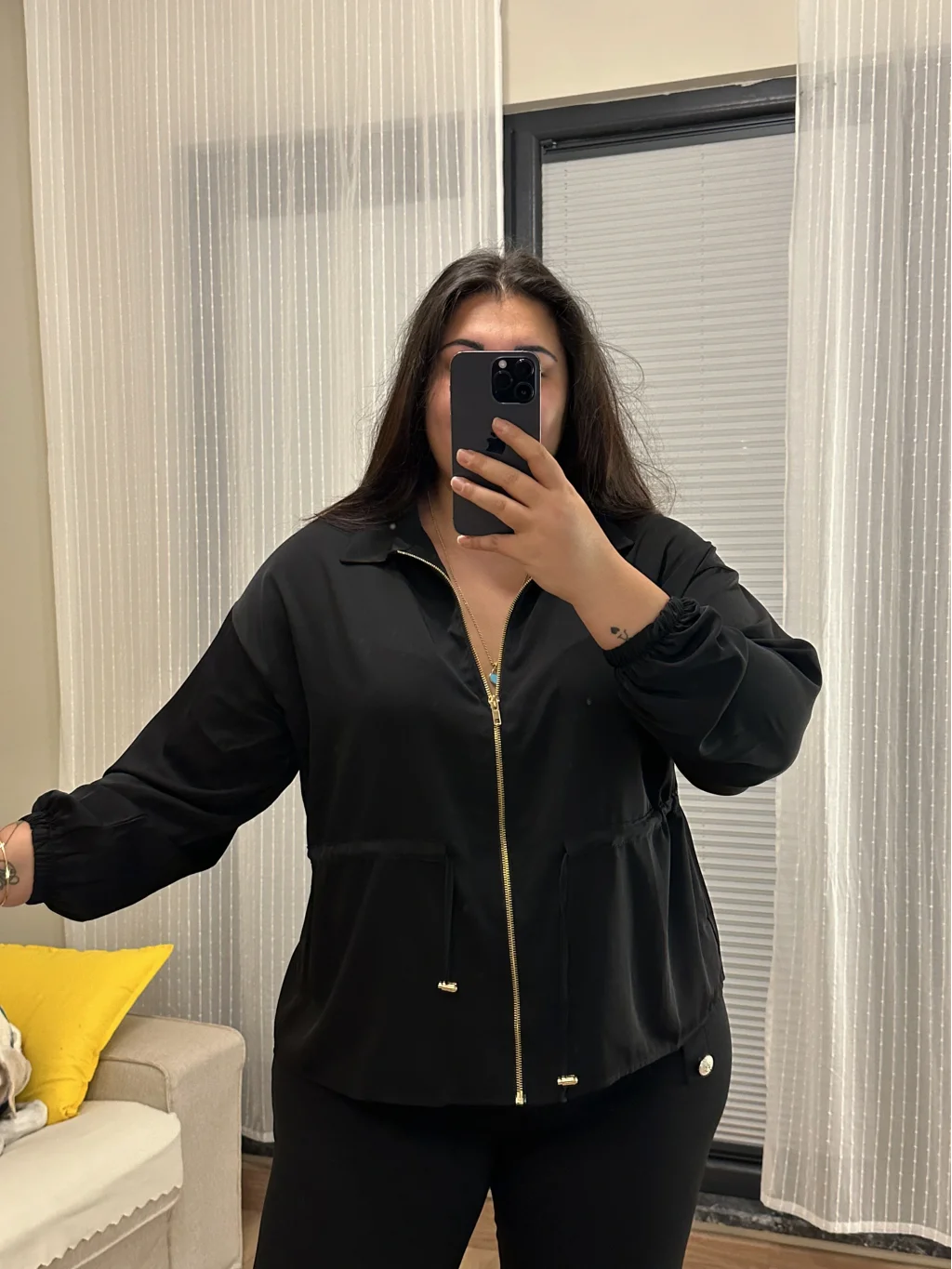 Pastel markalı fermuarlı lastik detaylı bomber hırka, büyük beden kadınların şıklığını tamamlayacak bir seçenek.