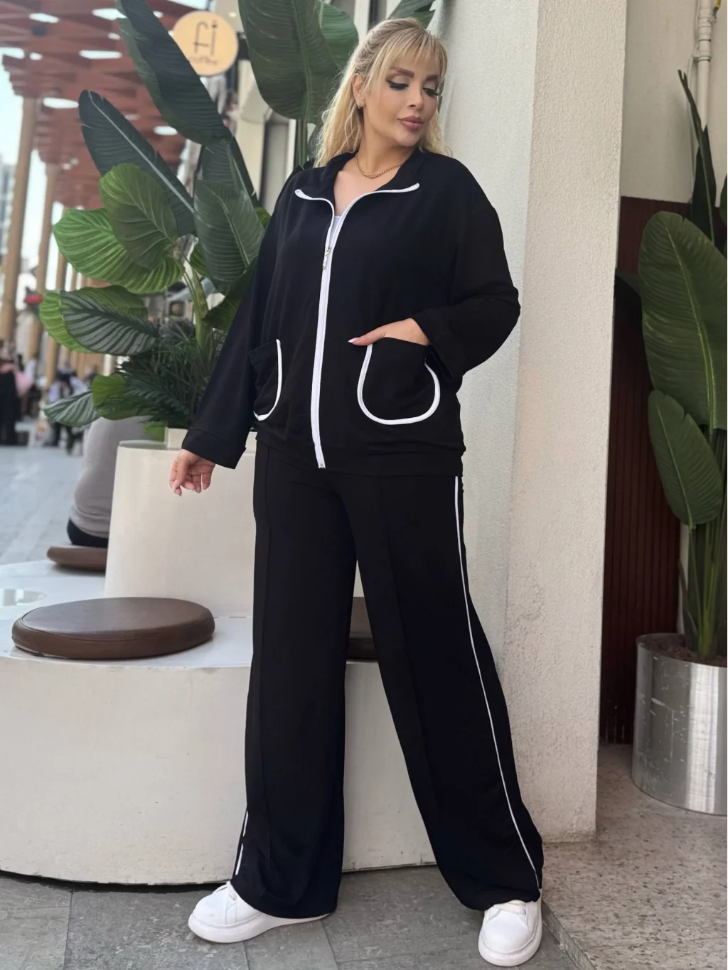 • PASTEL Fermuarlı Şerit Detaylı Esnek Modal Takım - Siyah, Büyük Beden Kadın Takımı için şık ve rahat bir seçenektir.