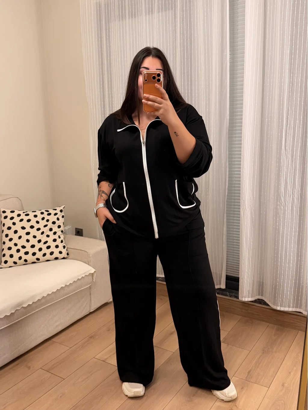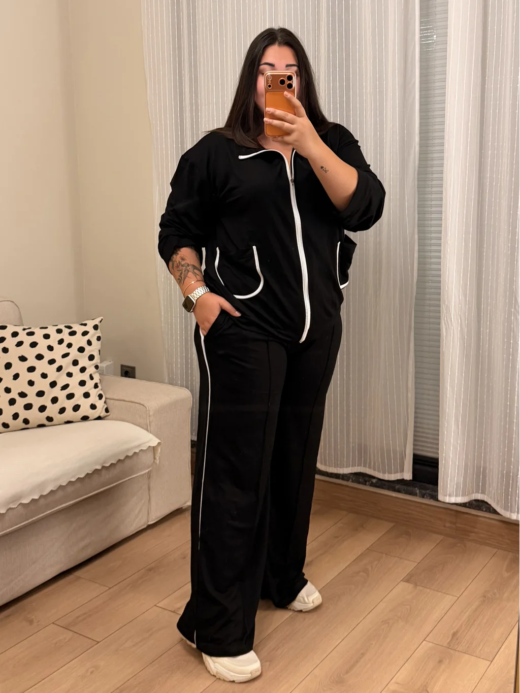 • PASTEL Fermuarlı Şerit Detaylı Esnek Modal Takım - Siyah, Büyük Beden Kadın Takımı için şık ve rahat bir seçenektir.