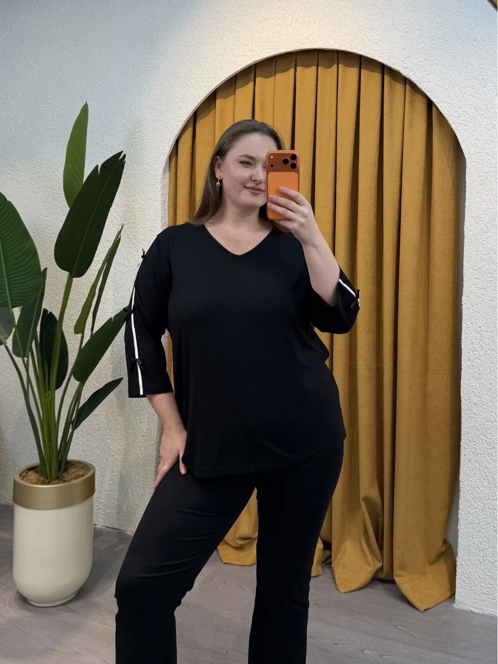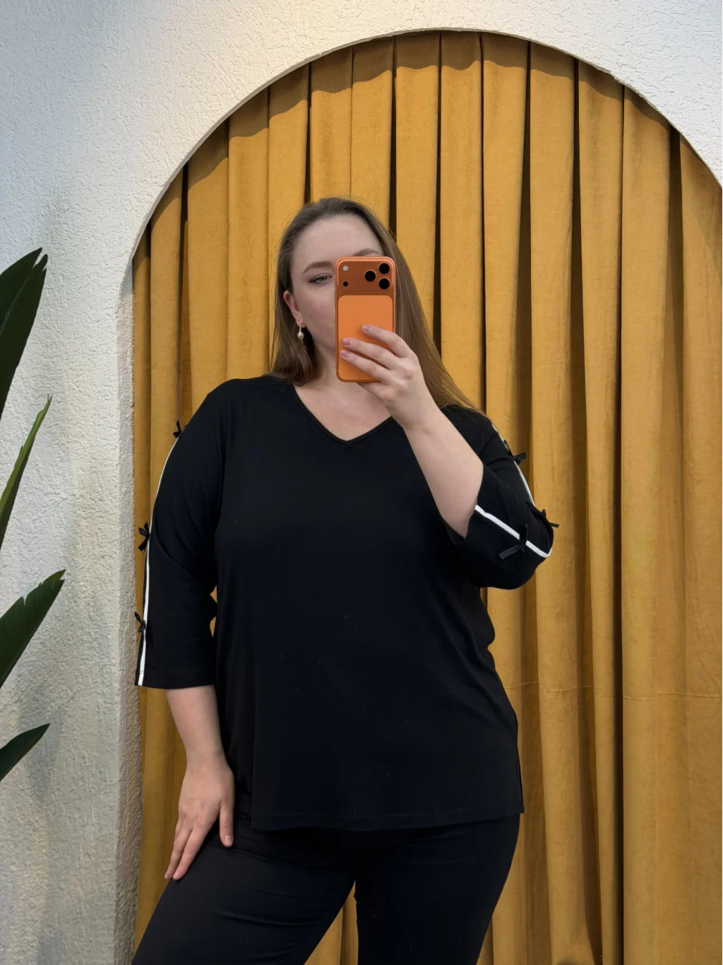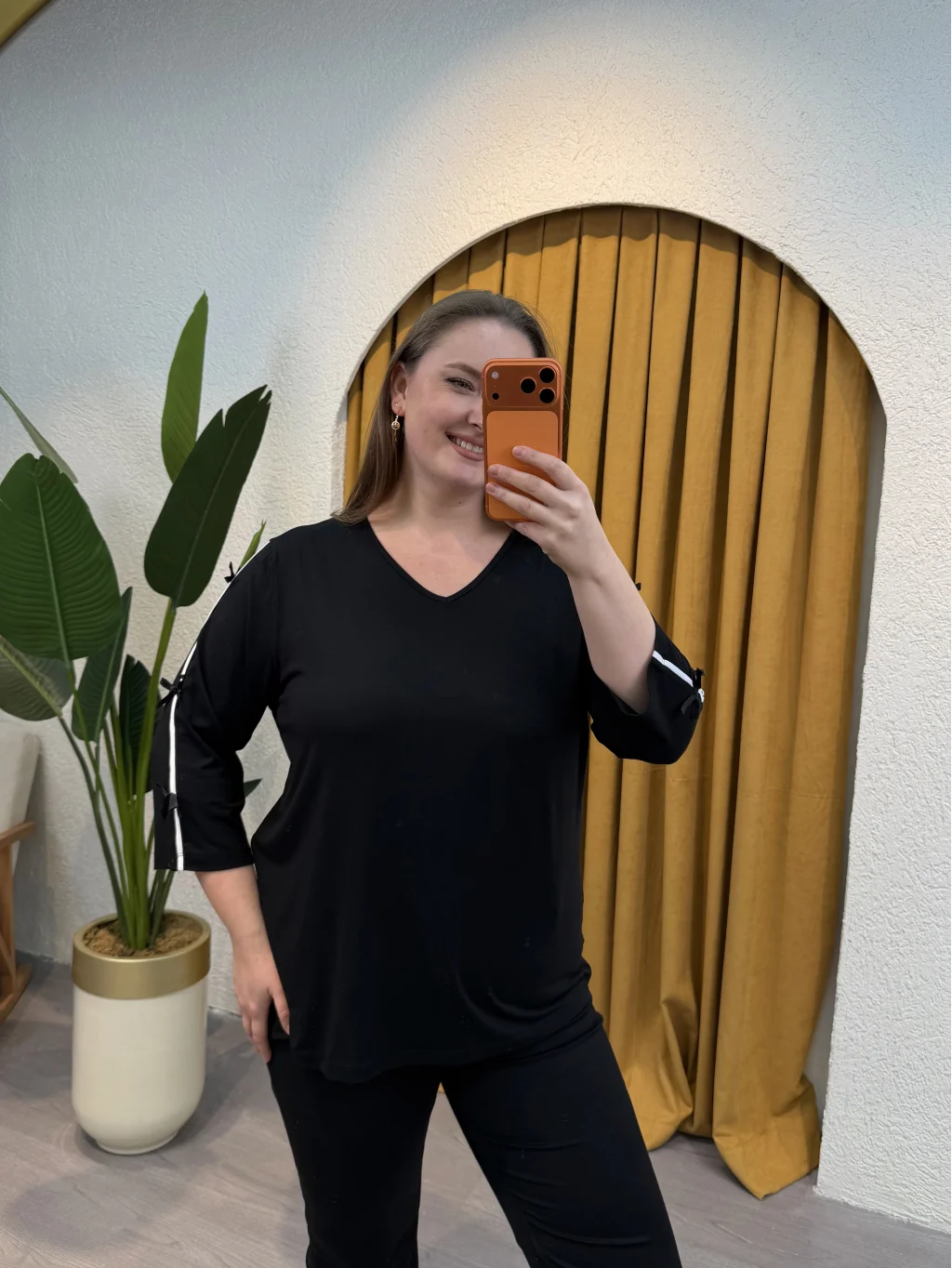Sim Detaylı Geniş Kesim Penye Bluz - Siyah