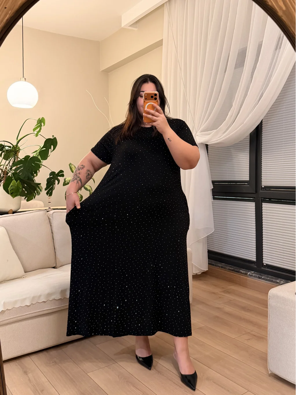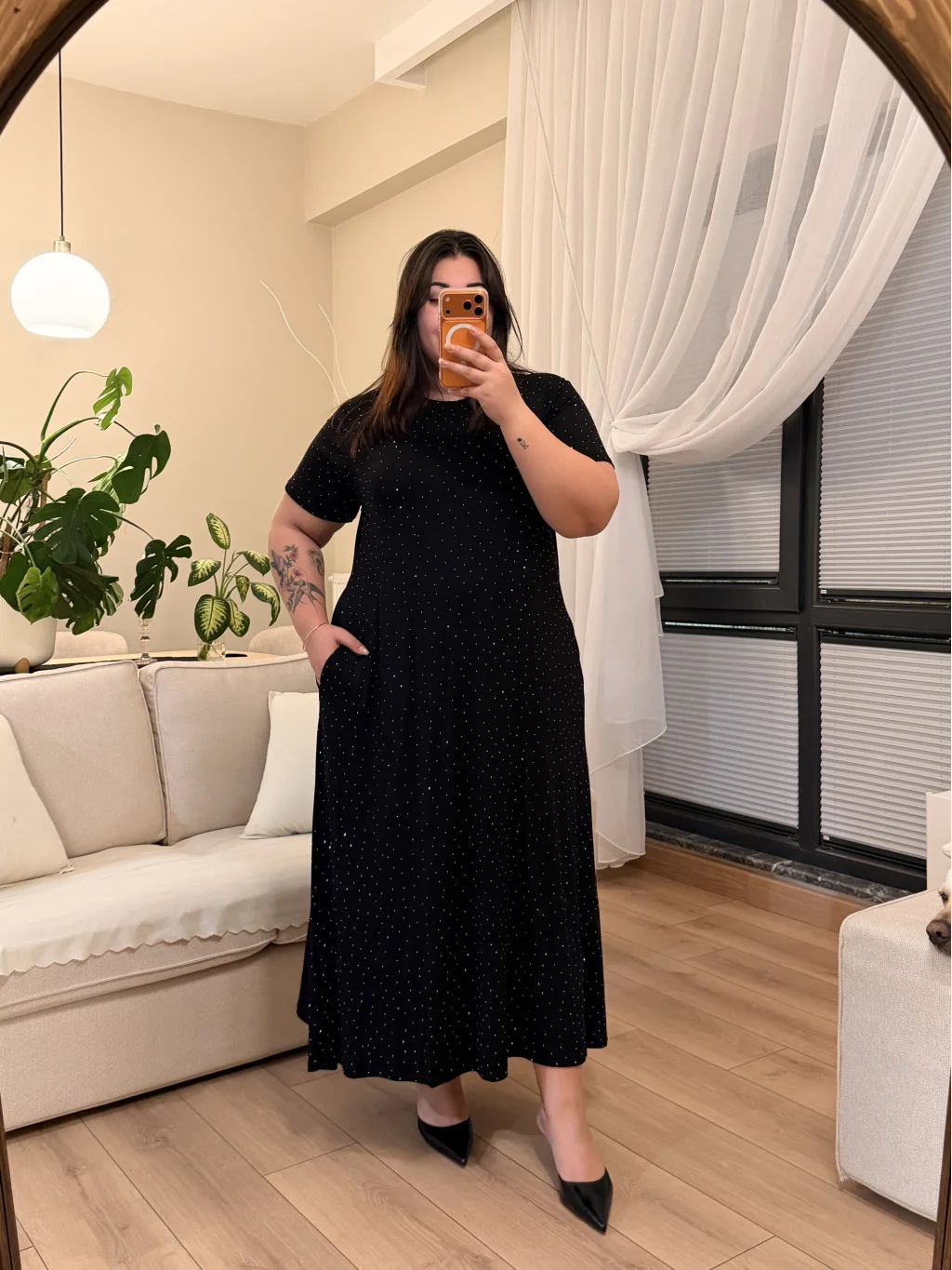 Geniş Kesim Cepli Taşlı Penye Elbise - Siyah
