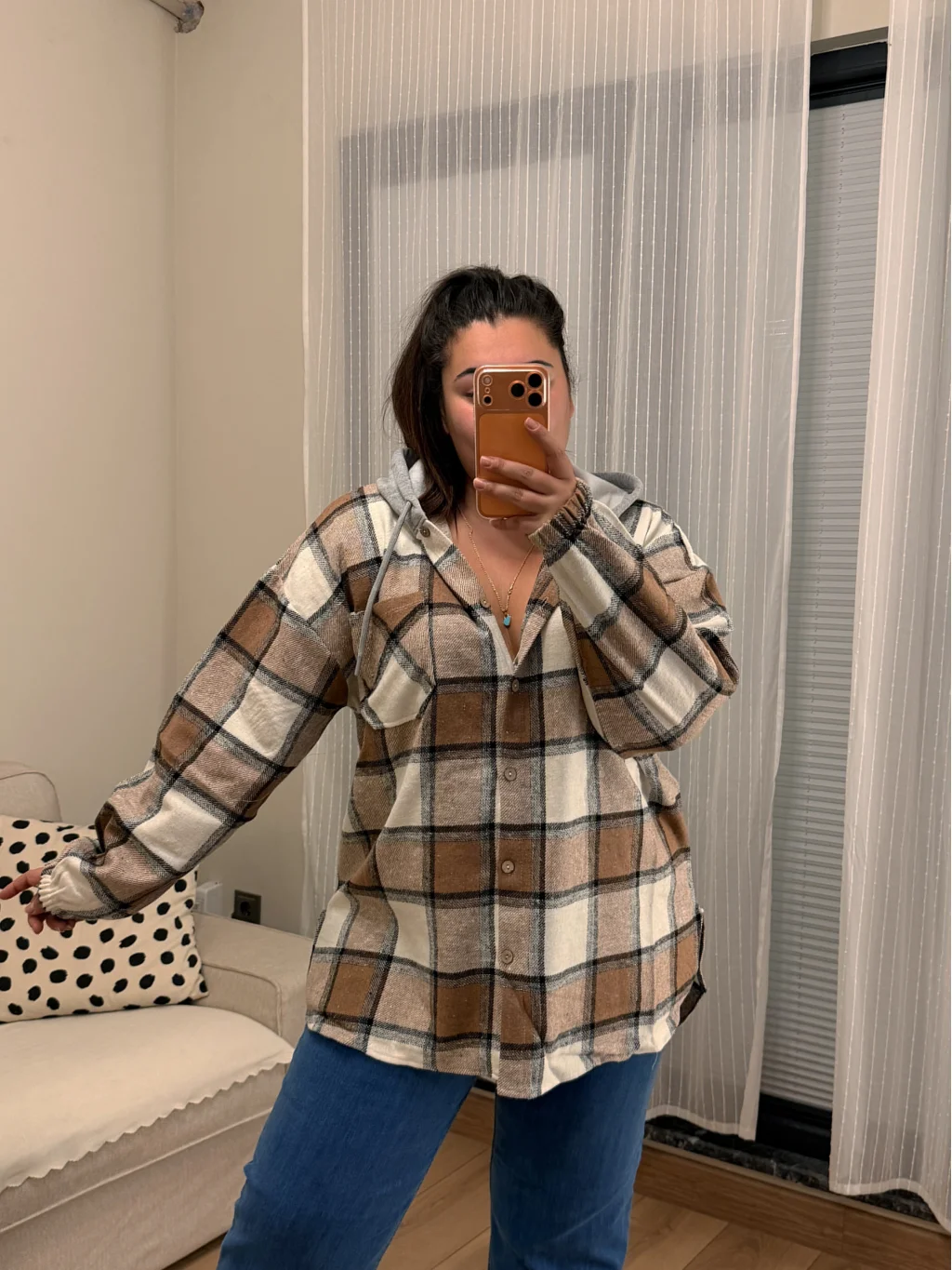 PASTEL Geniş Kesim Kapüşonlu Oduncu Gömlek - Vizon, büyük beden kadın gömleği arayanlar için ideal bir seçenektir.