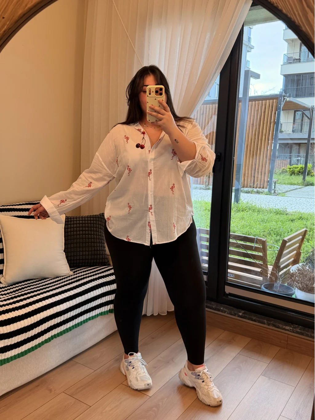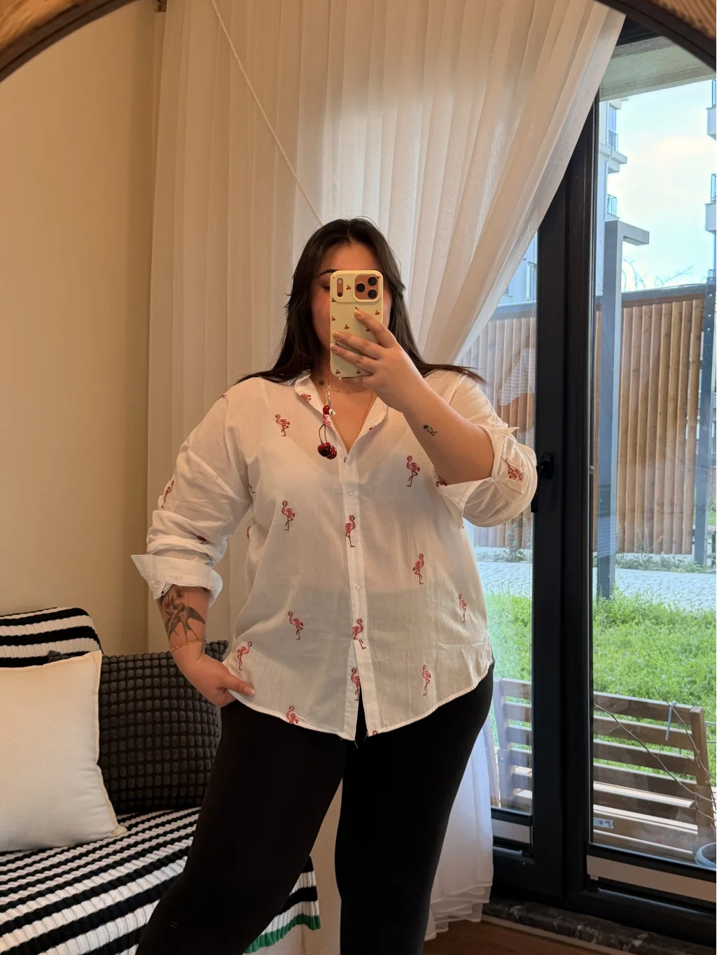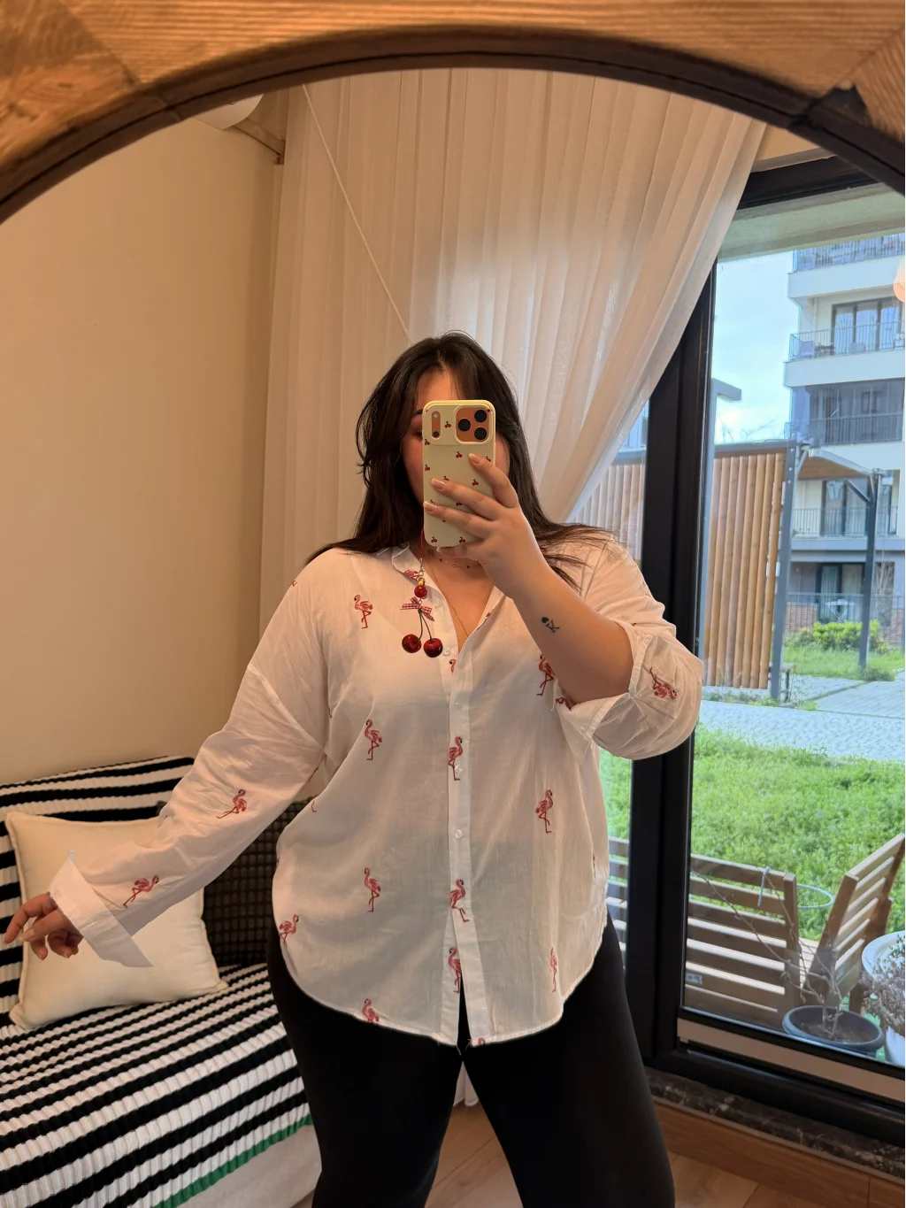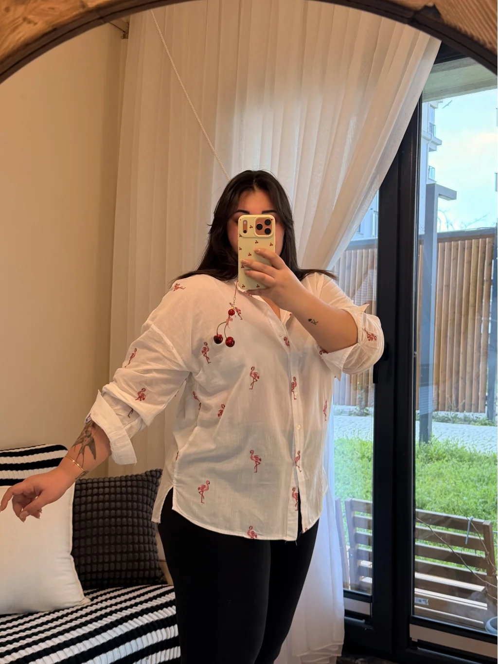 Pastel Butik'un büyük bedenler için tasarladığı geniş kesim pamuklu gömlek, zarif flamingo nakışlarıyla fark yaratıyor.