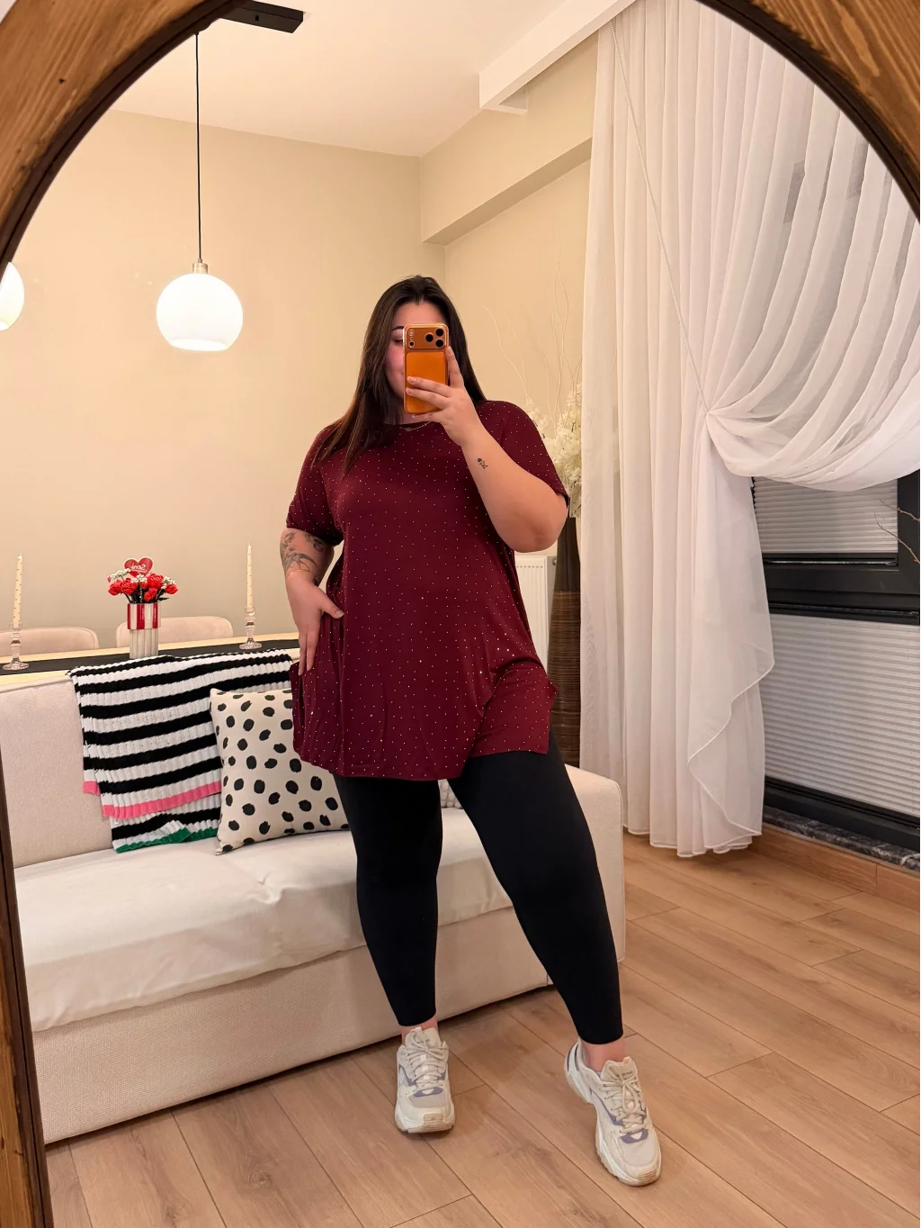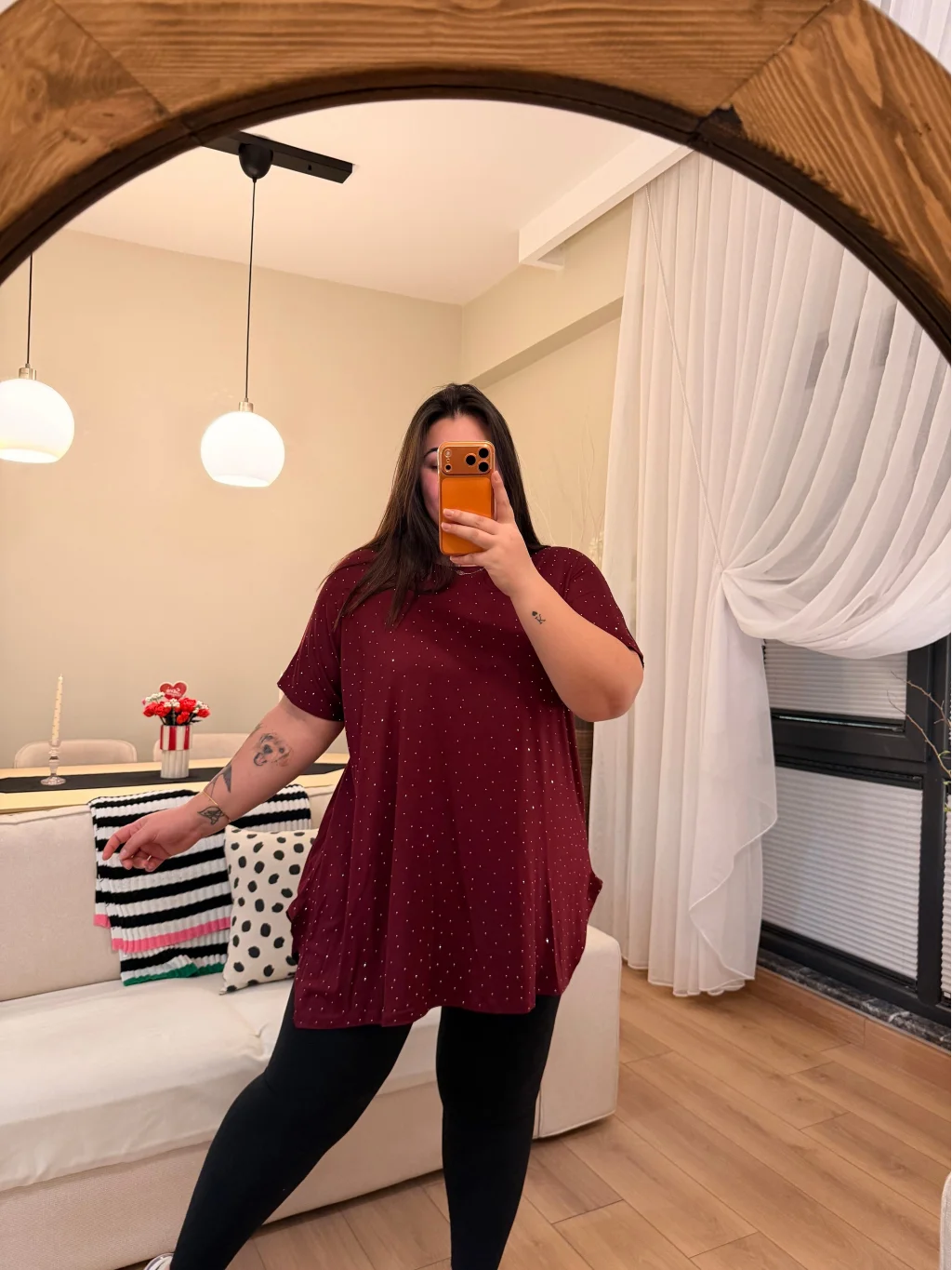 Geniş Kesim Taş Detaylı Penye Bluz - Bordo