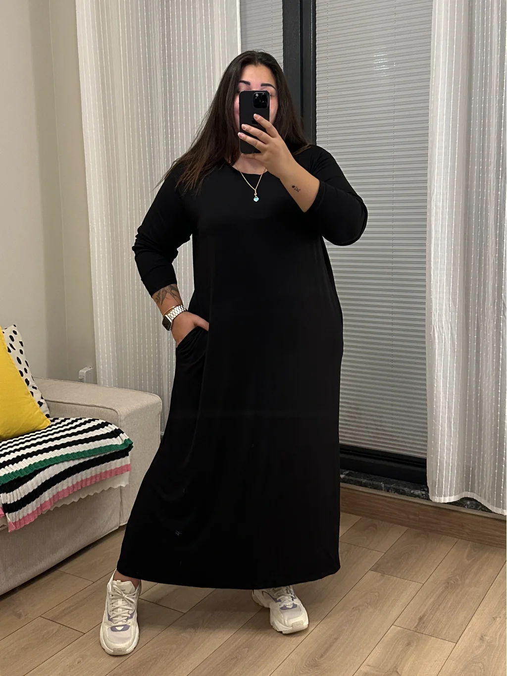 Pastel marka Gizli Cep Basic Esnek Penye Elbise - Siyah, büyük beden kadın elbise arayanlar için ideal bir tercihtir.