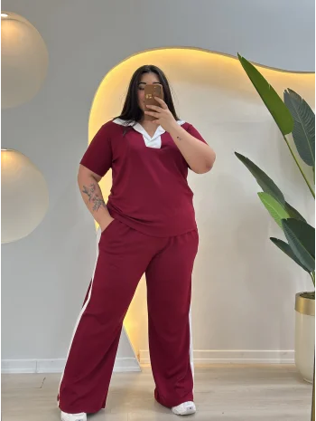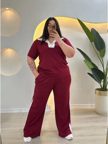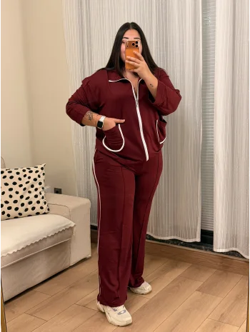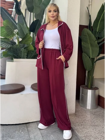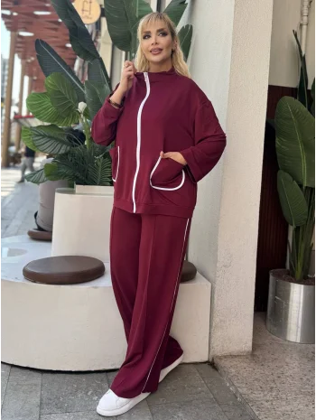 Fermuarlı Şerit Detaylı Esnek Modal Takım - Bordo