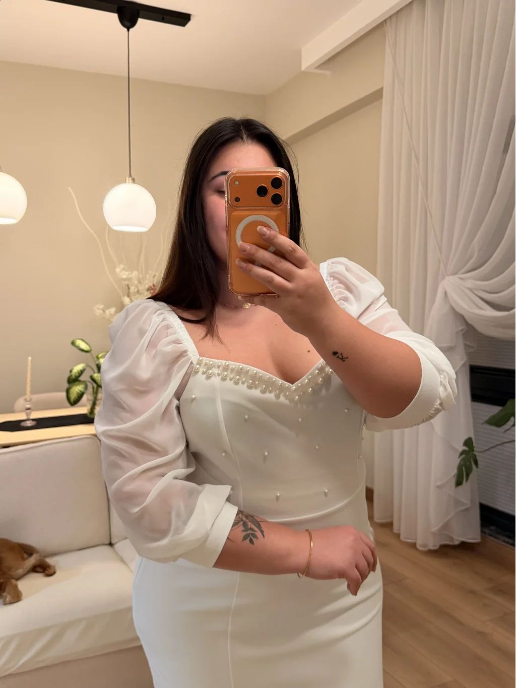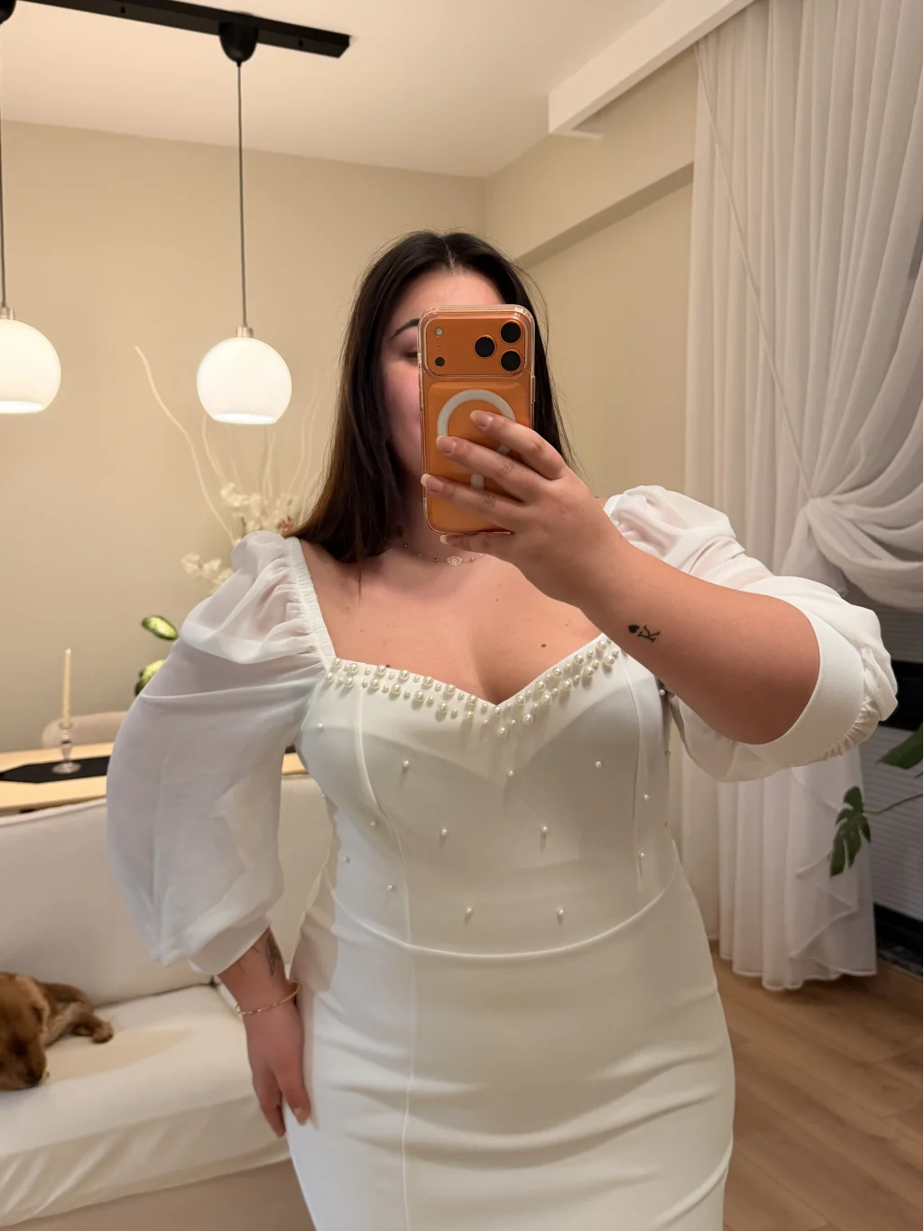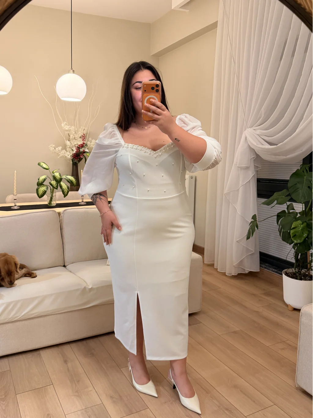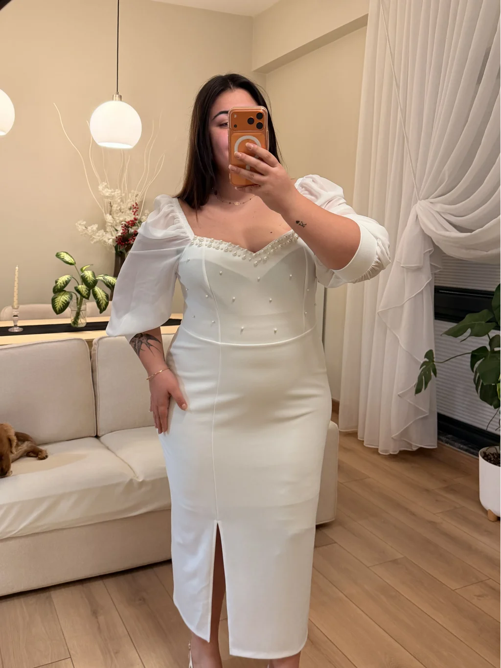 Kalp Yaka, Kolları Şifon, Esnek Krep Kumaş, İnci Detaylı Elbise