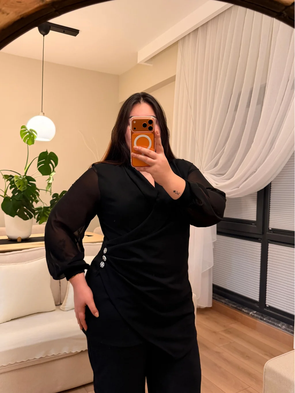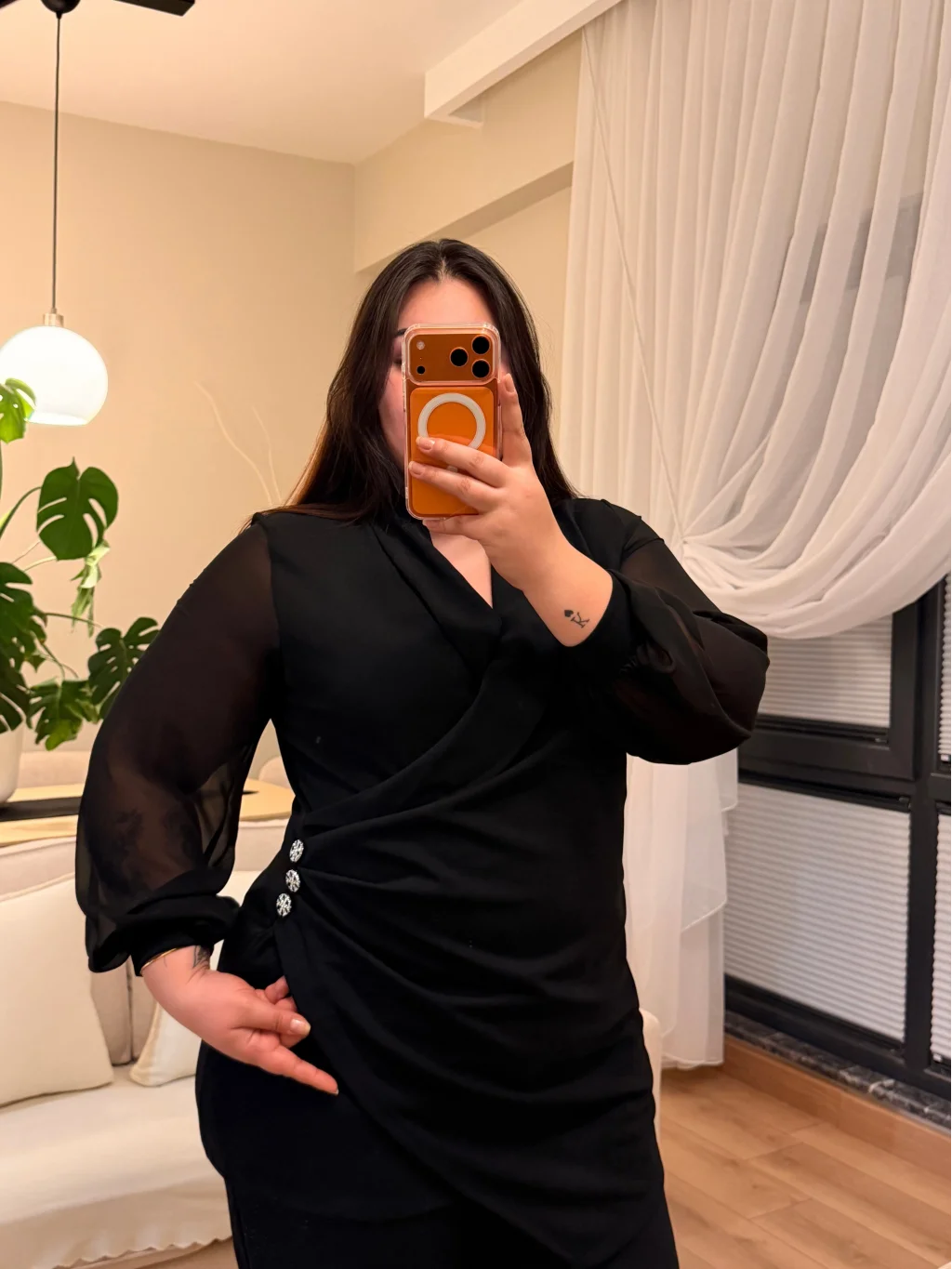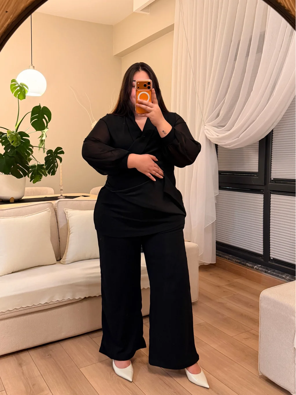 Modelin Ölçüleri: Boy: 1.75 cm Kilo: 105 kg Bel: 105 cm Göğüs: 116 cm Basen: 140 cm Modelin Giydiği Beden 46 Beden