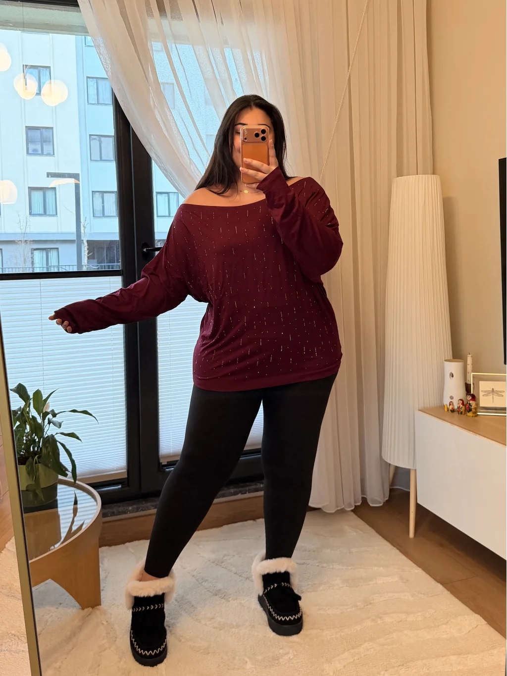 Kayık Yaka Taşlı Modal Bluz - Mürdüm