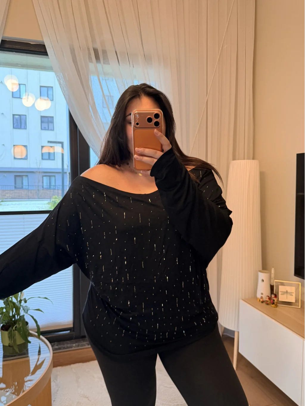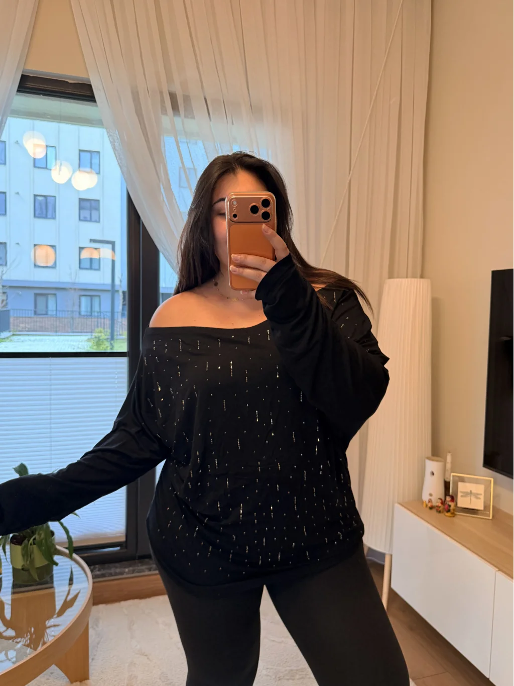 Kayık Yaka, Taş Detaylı, Modal Kumaş, Rahat Kalıp Esnek, Likralıdır