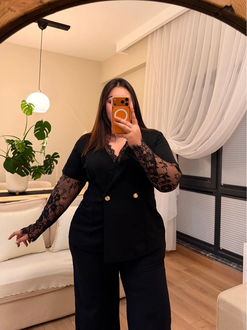 Kolları Dantel Detaylı İkili Krep Takım - Siyah