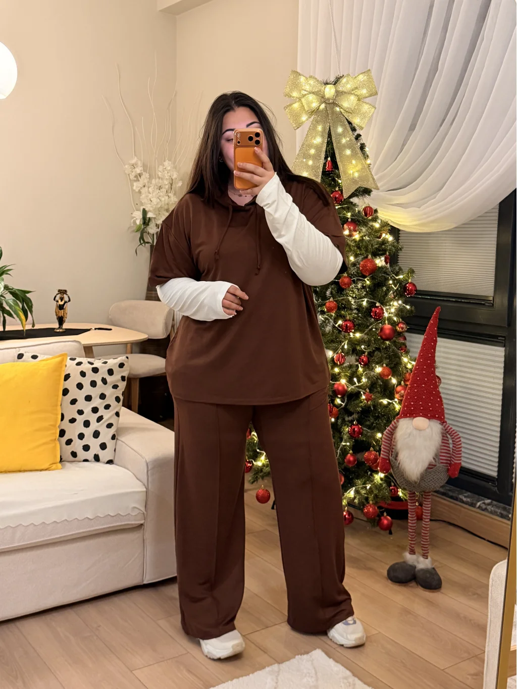 Kolları Parçalı Modal Kapüşonlu Takım - Kahverengi