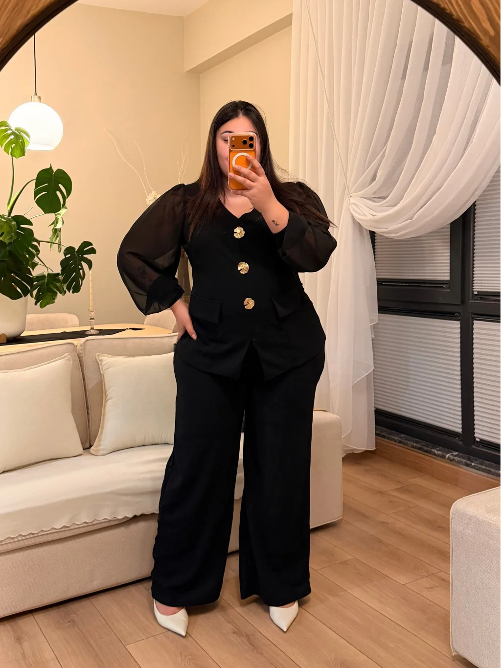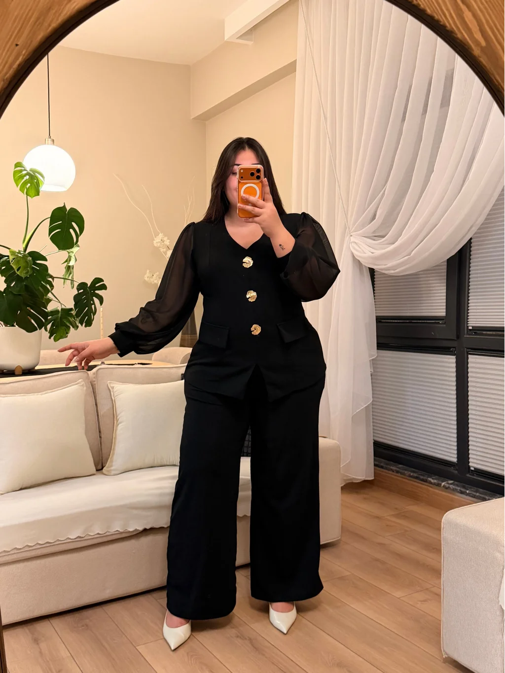 V Yaka, Rahat Kalıp, Esnek Krep Kumaş, İstiridye Kolları Şifon, Aksesuar Detaylı, İkili Takım