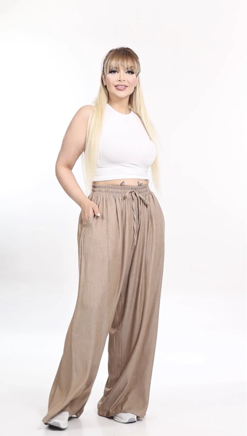 Geniş Kesim , Premium Kot Görünümlü Tensel Kumaş, Extra Yüksek Bel, Cepli, Beli İplidir
