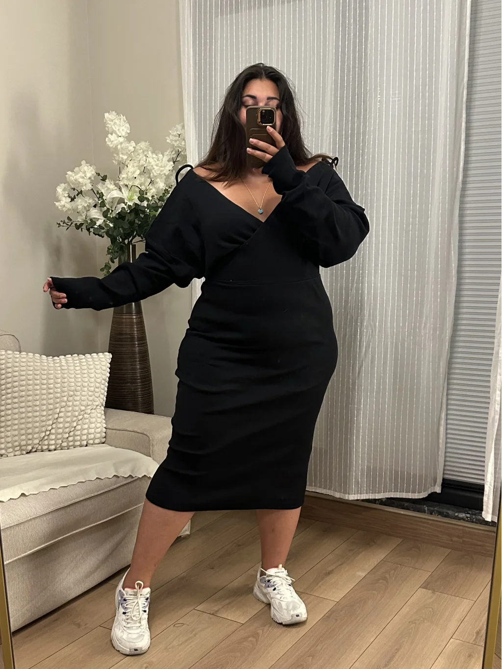 PASTEL Kruvaze Yaka Esnek Triko Elbise - Siyah, büyük beden kadın elbise modasına şıklık katar.