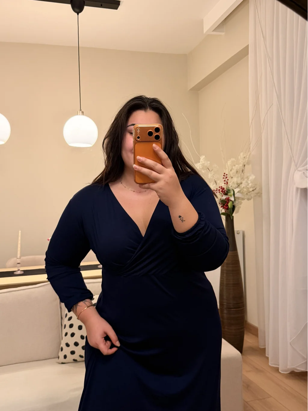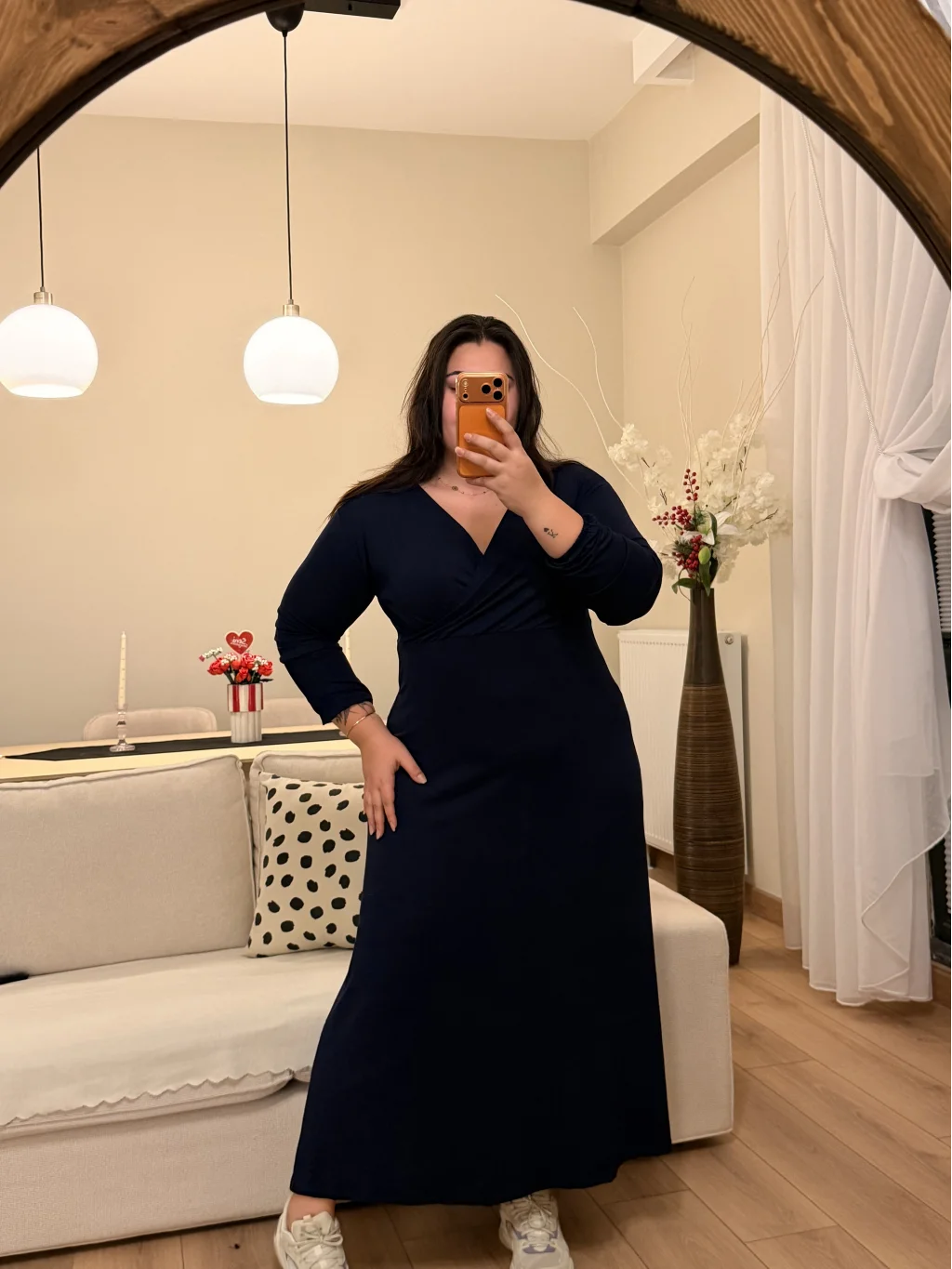 Kruvaze Yaka Pamuklu Esnek Penye Elbise - Lacivert