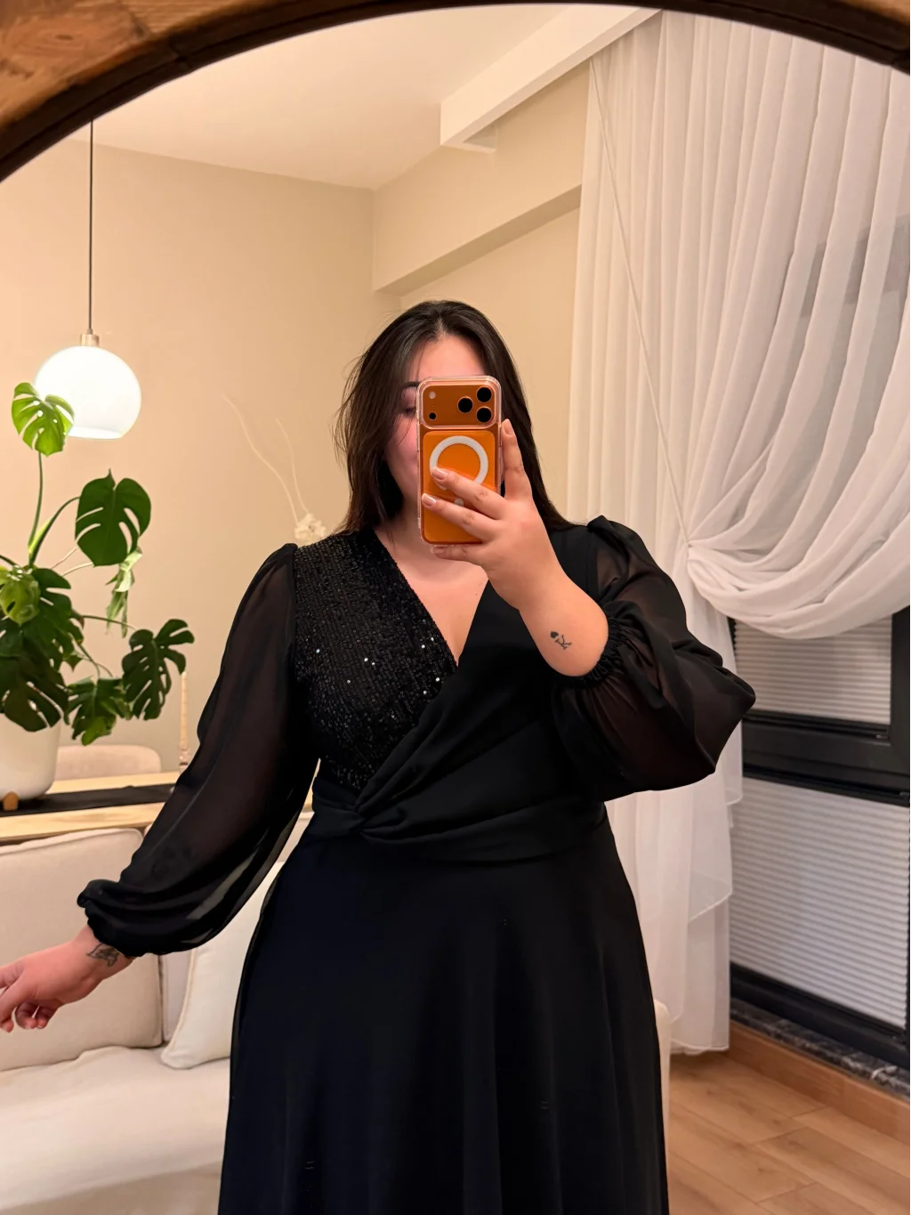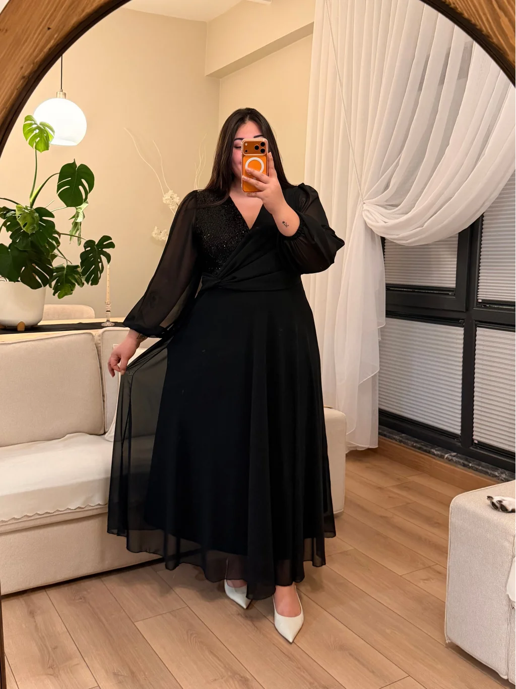 Kruvaze Yaka, Rahat Kalıp, Pul Payet Detaylı, Astarlı Şifon Elbise