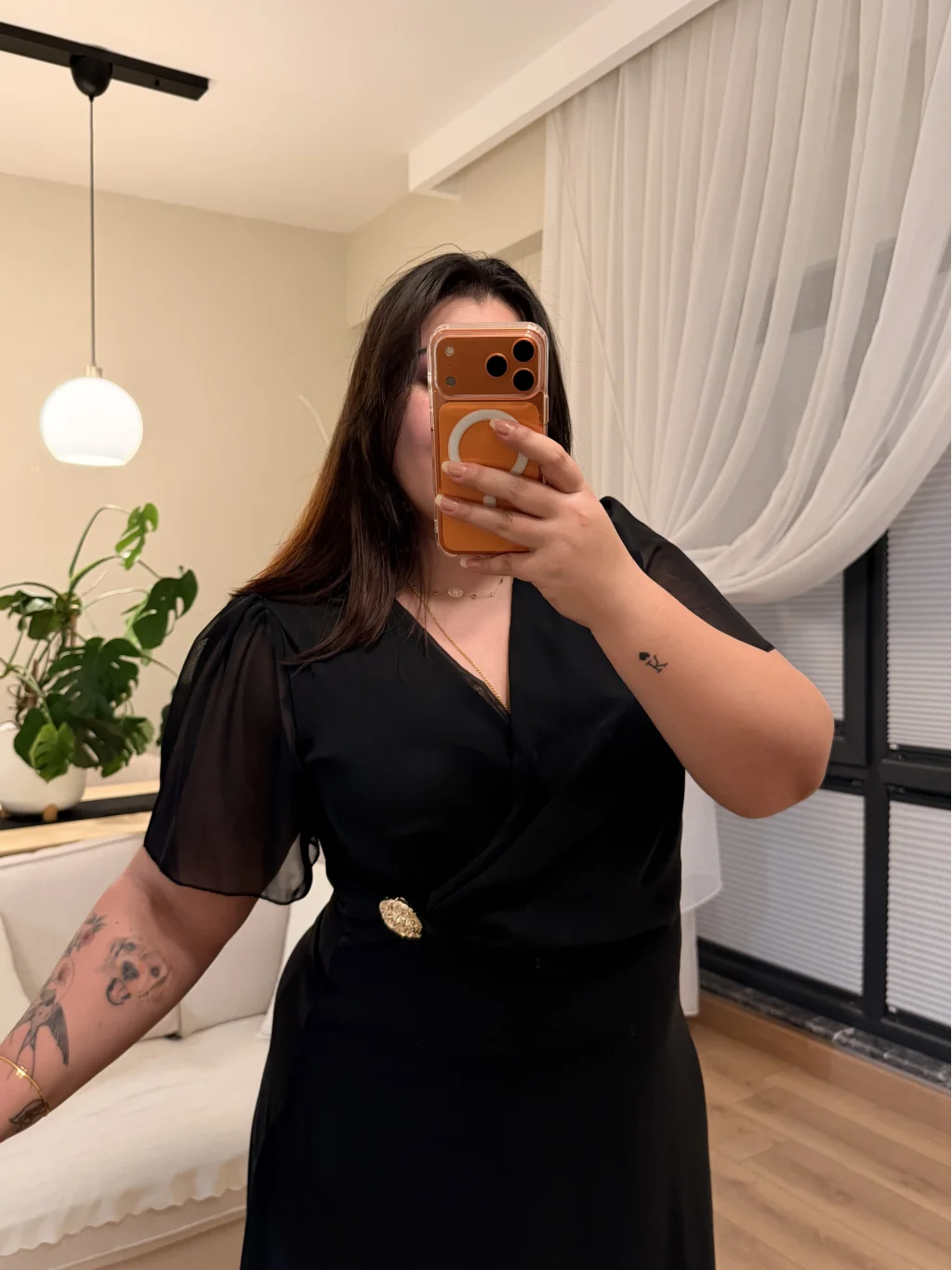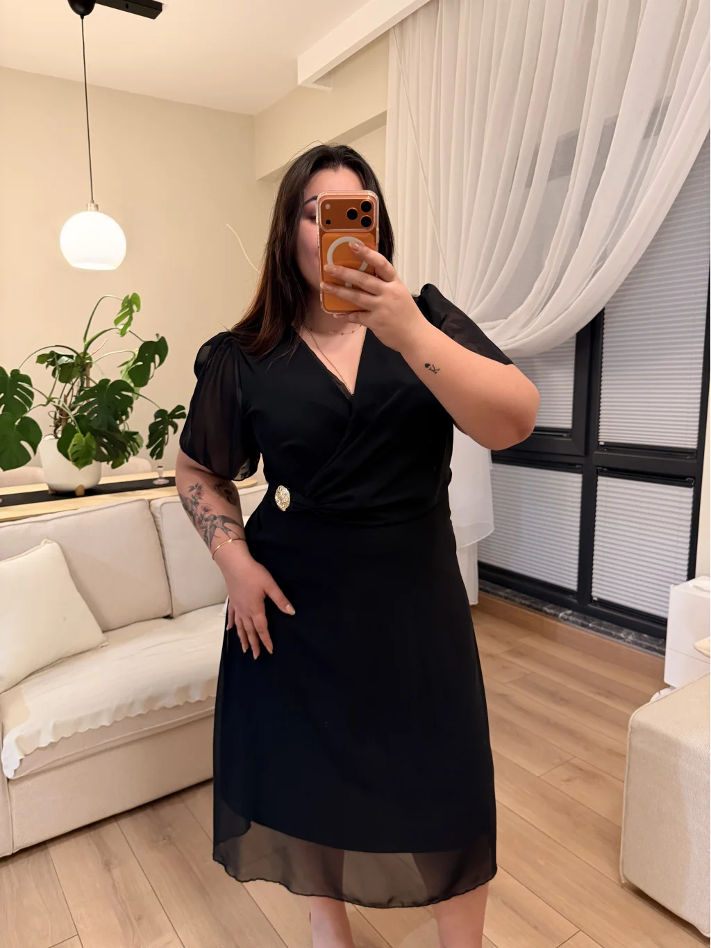 Kruvaze Yaka, Kolları Şifon, Astarlı Şifon Kumaş, Toka Detaylı ElbiseModelin Ölçüleri: Boy: 1.75 cm Kilo: 105 kg Bel: 105 cm Göğüs: 116 cm Basen: 140 cm Modelin Giydiği Beden 46 Beden