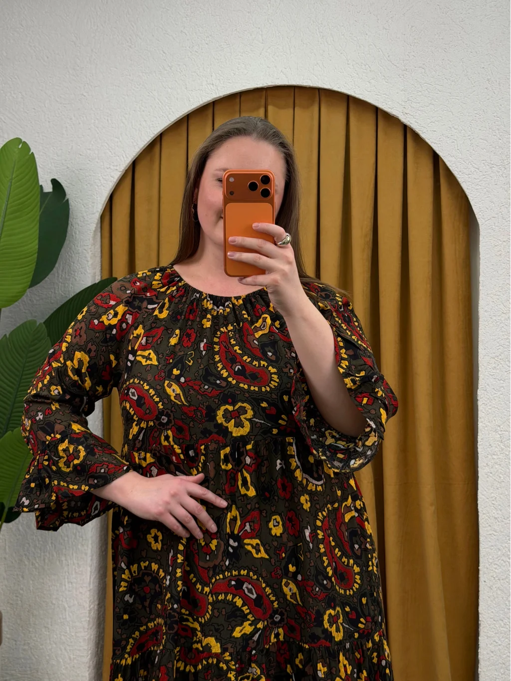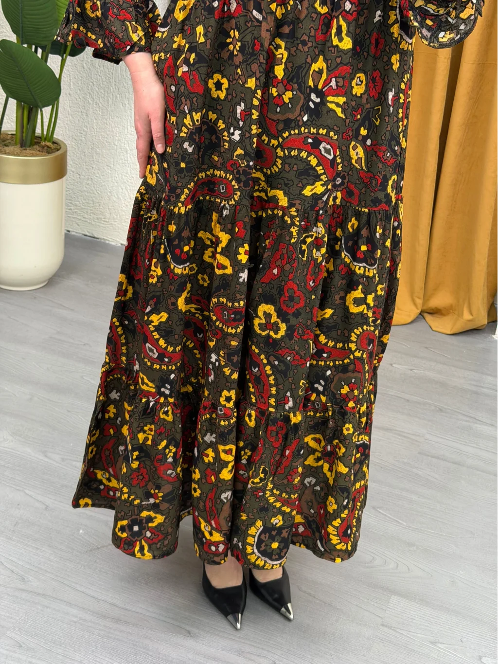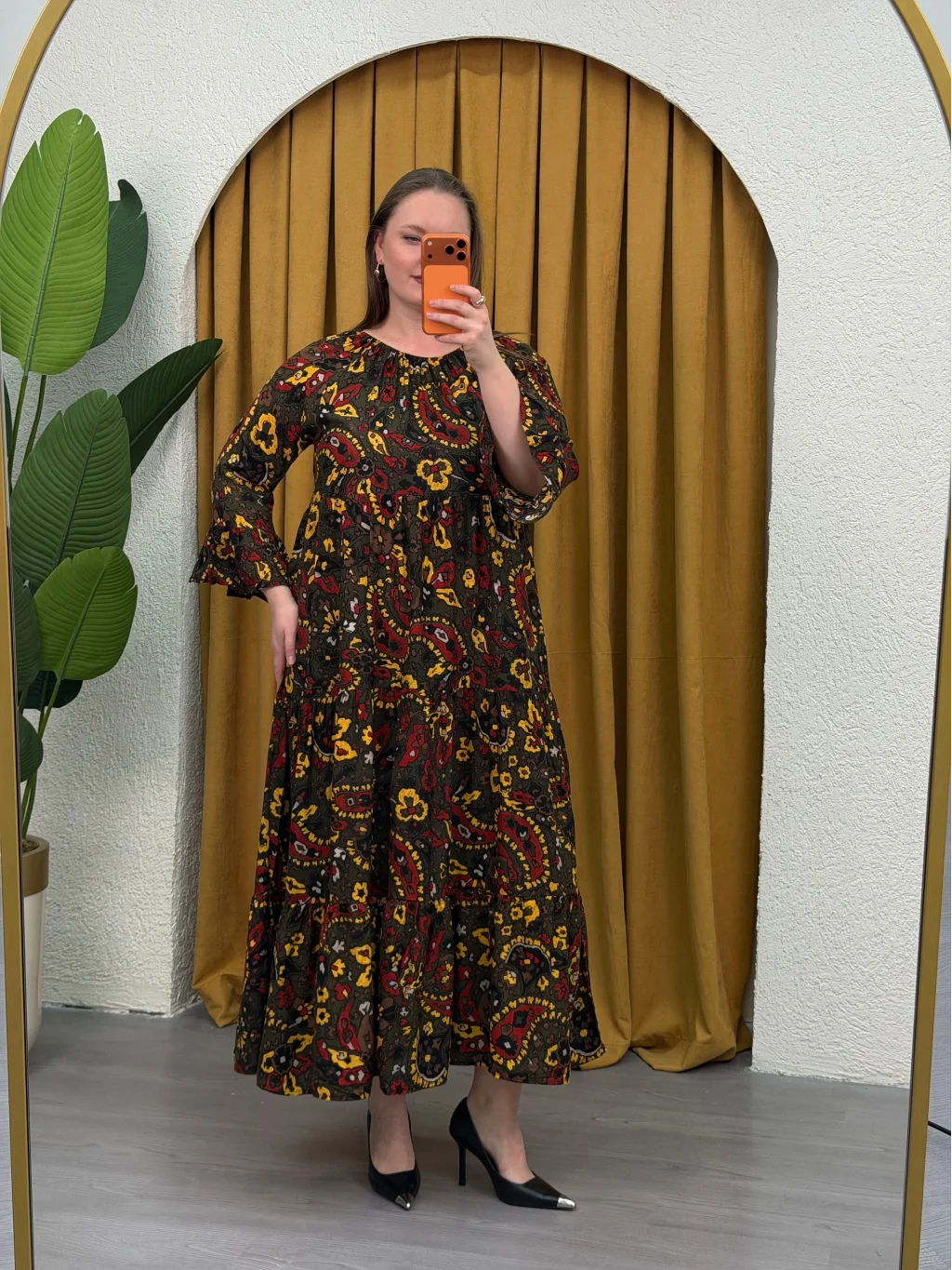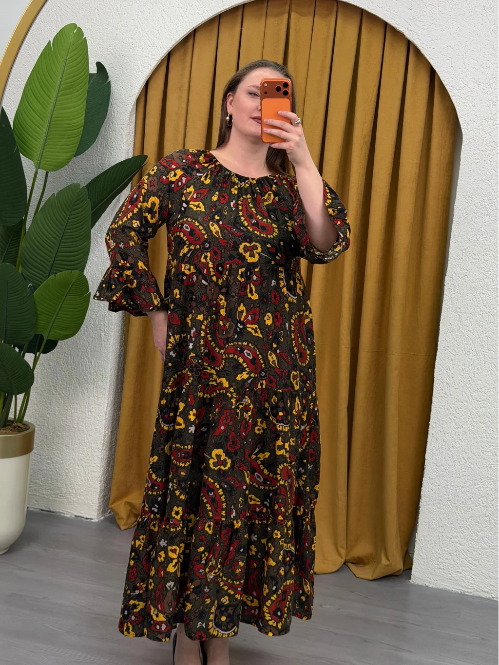 Madonna Yaka Viskon Elbise - Etnik Desen
