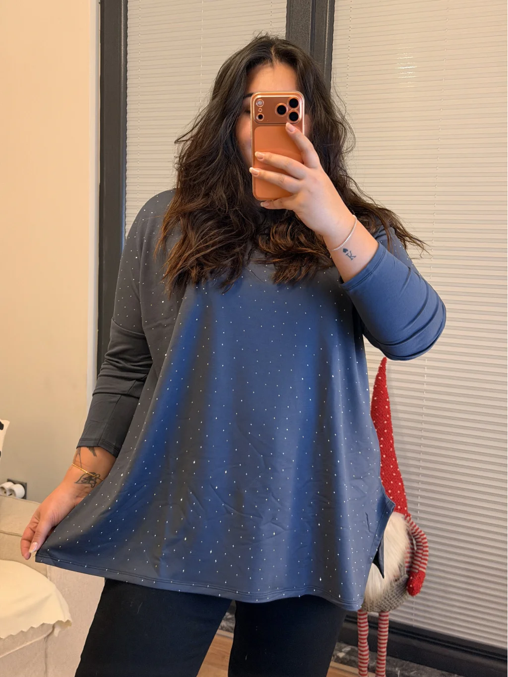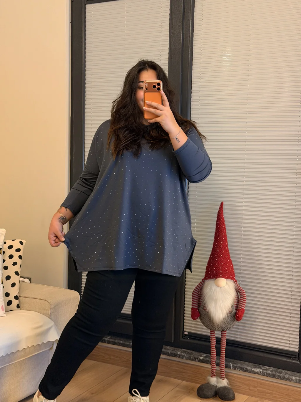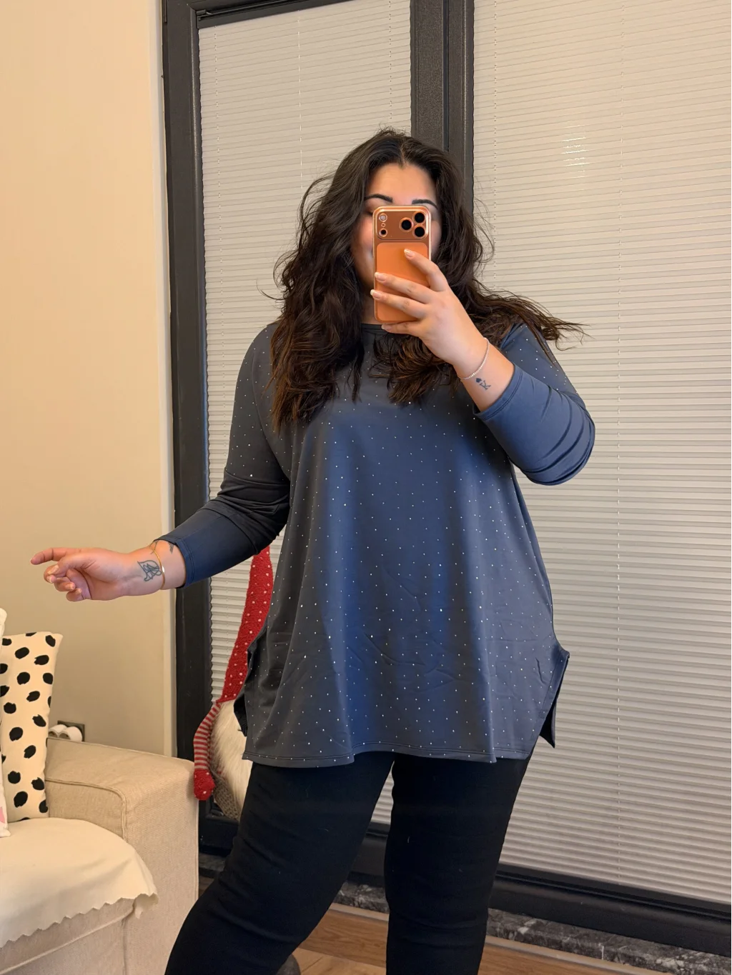 Pastel Modal Kumaş Esnek Taş Detaylı Antrasit Bluz, şıklığı ve rahatlığı bir arada sunar.