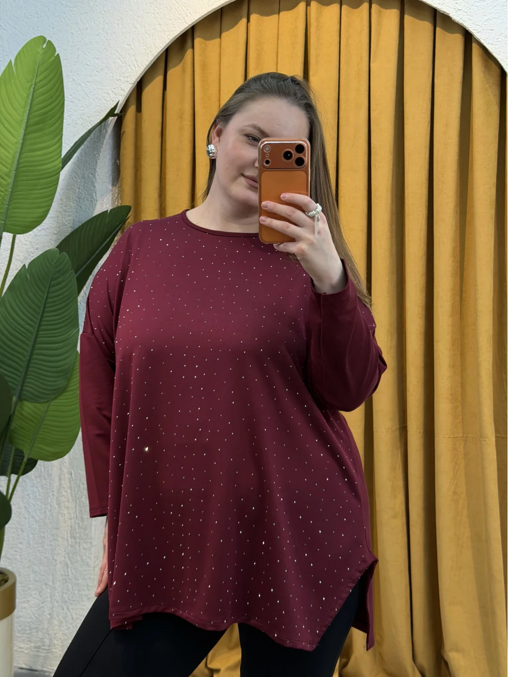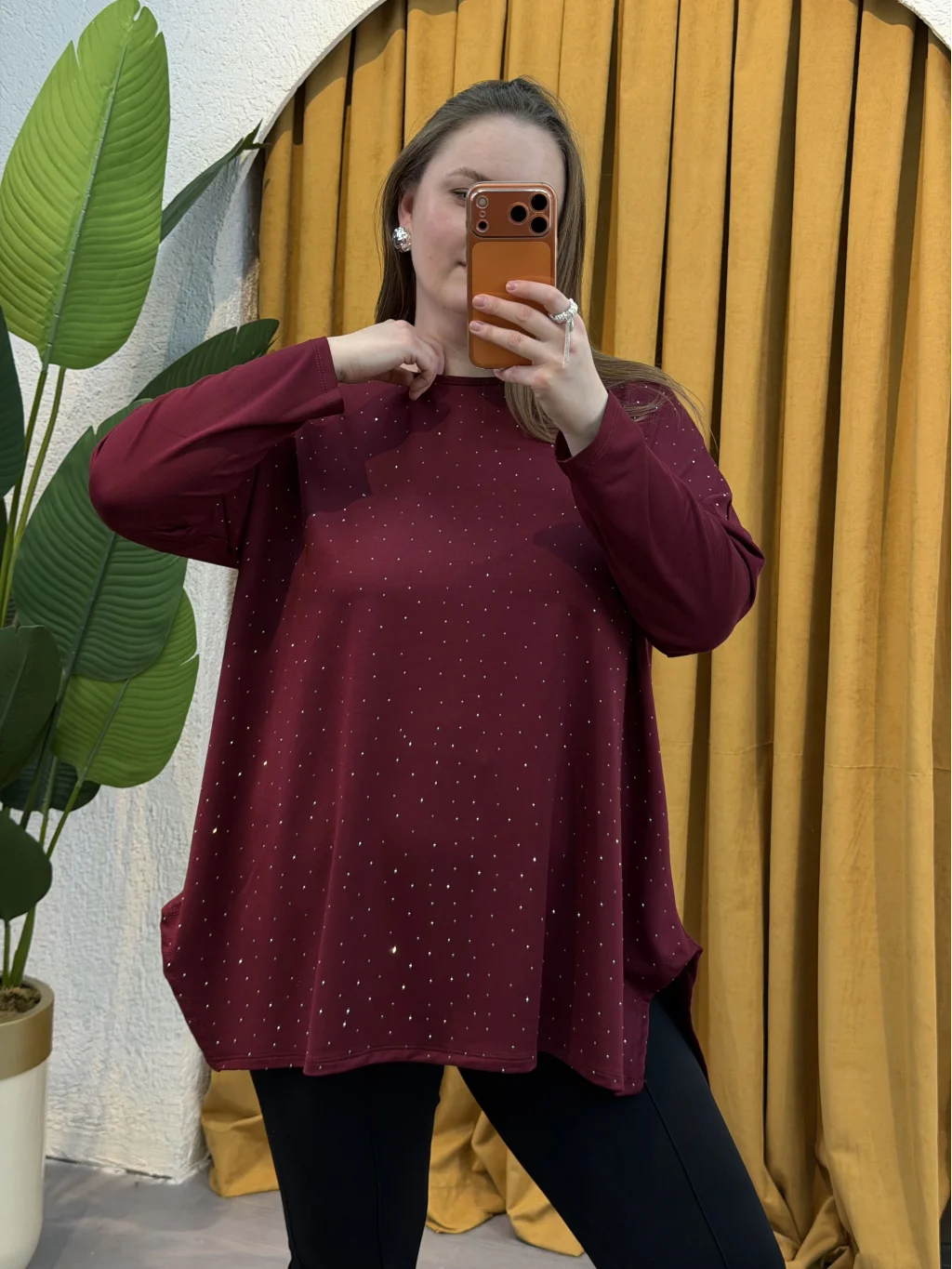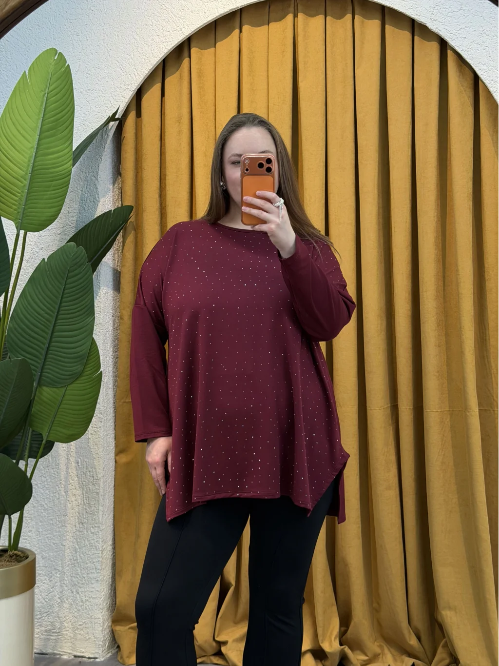 Pastel Modal Kumaş Esnek Taş Detaylı Bordo Bluz, şıklığı ve rahatlığı bir arada sunar.