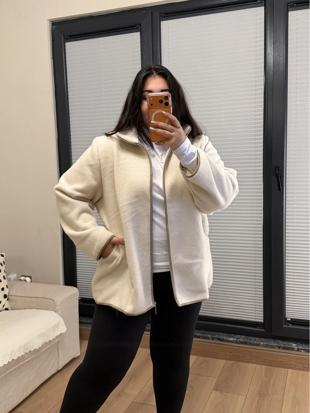 PASTEL BUTİK Oversize Premium Buklet Kumaş Kaban - Ekru, şıklığıyla ön plana çıkan bir dış giyim seçeneği.
