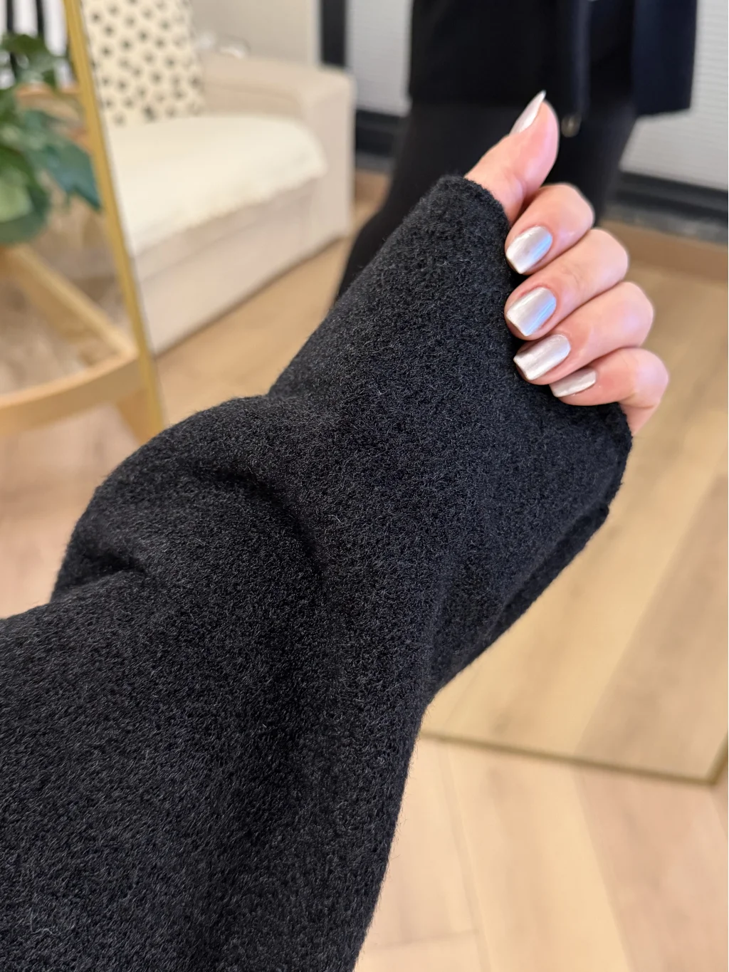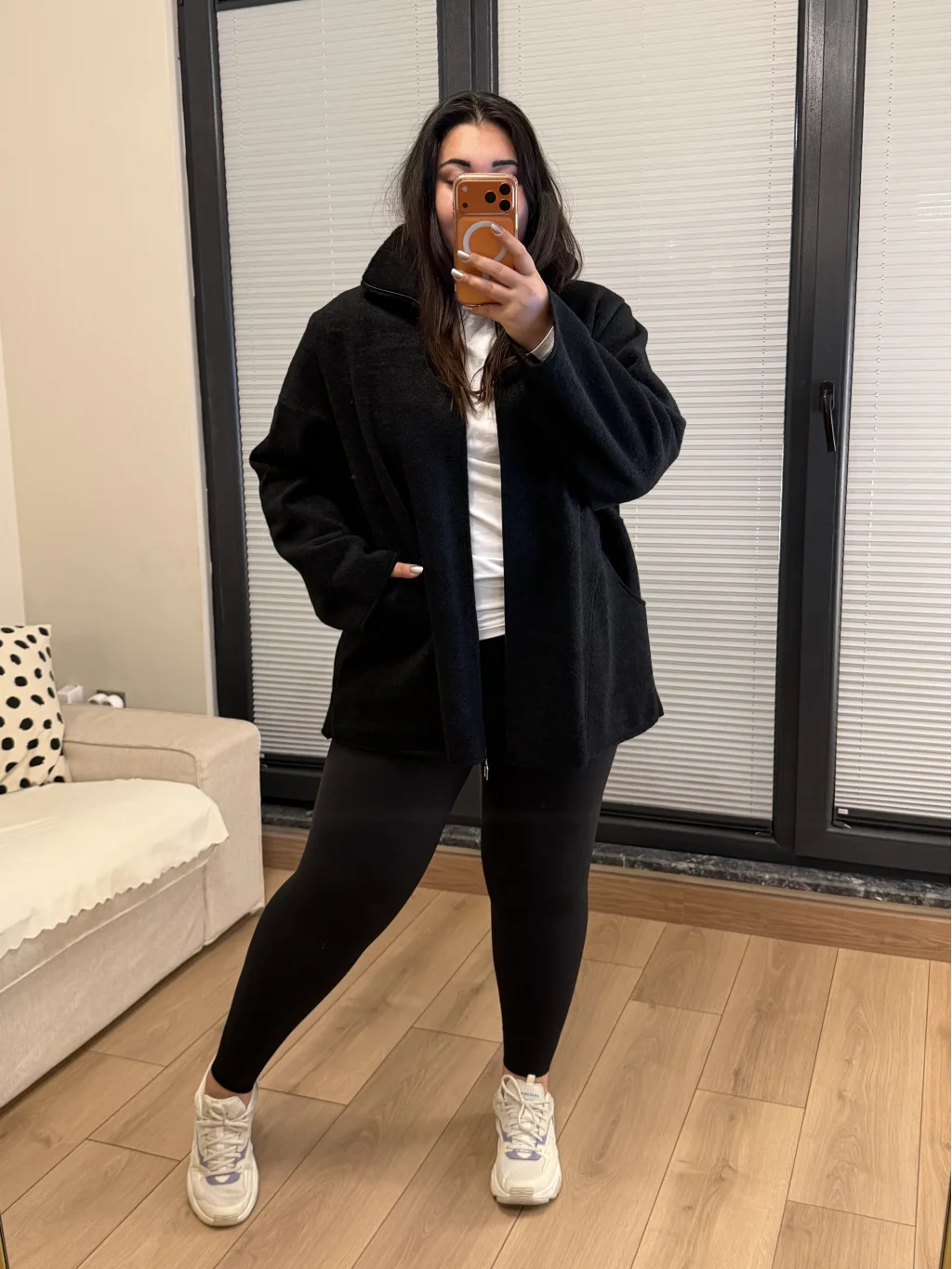 PASTEL BUTİK Oversize Premium Buklet Kumaş Kaban - Siyah, şıklığıyla ön plana çıkan bir dış giyim seçeneği.