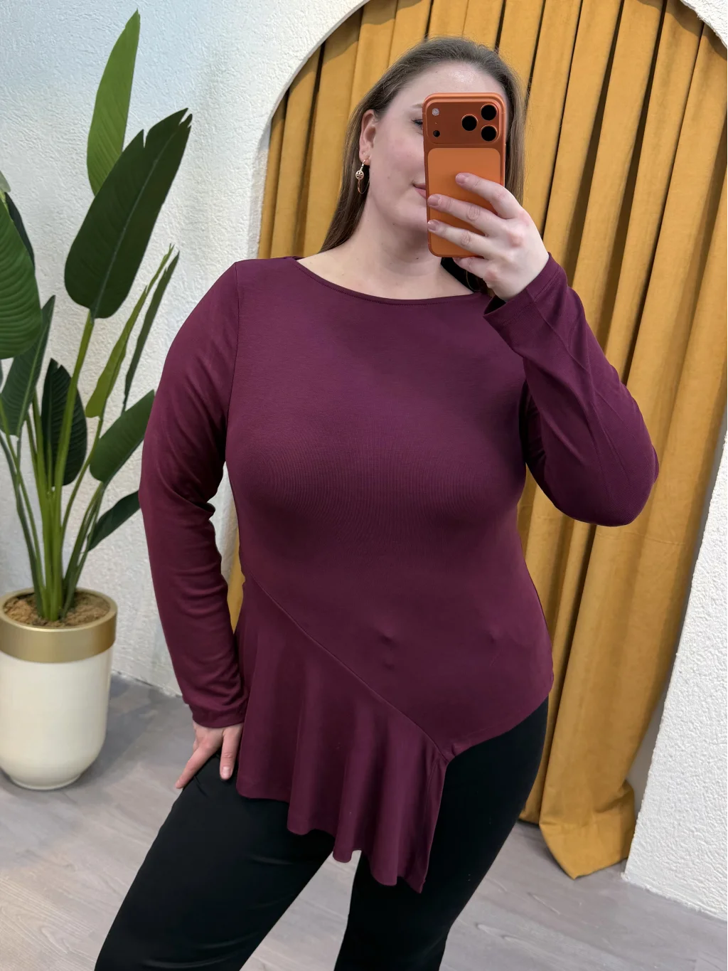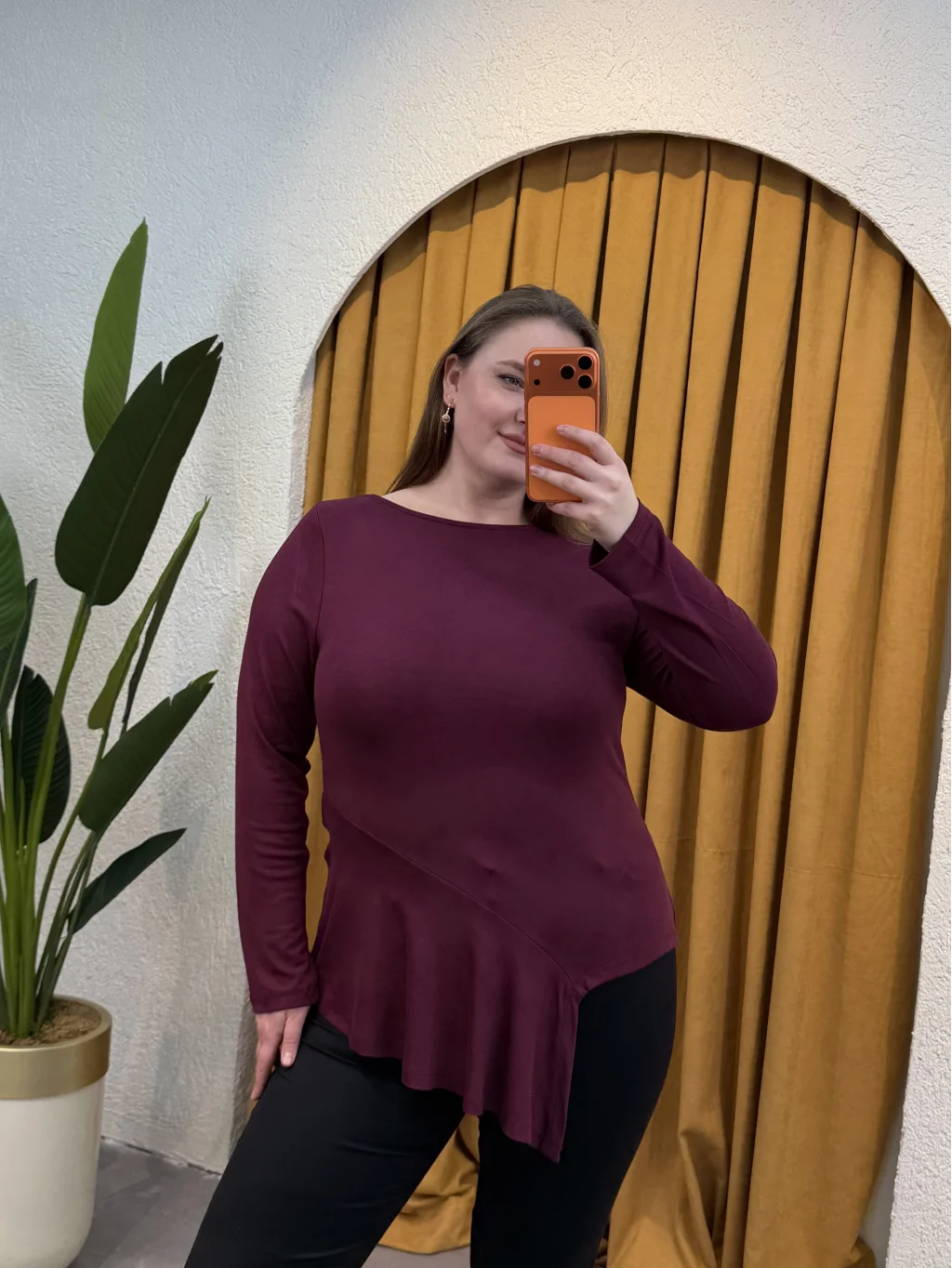 Pamuklu Yarım Asimetrik Esnek Penye Bluz - Mürdüm
