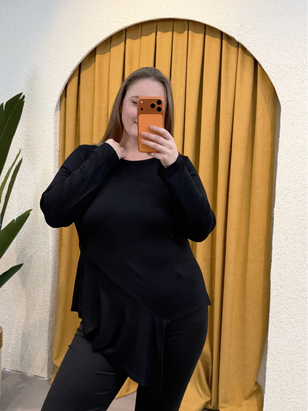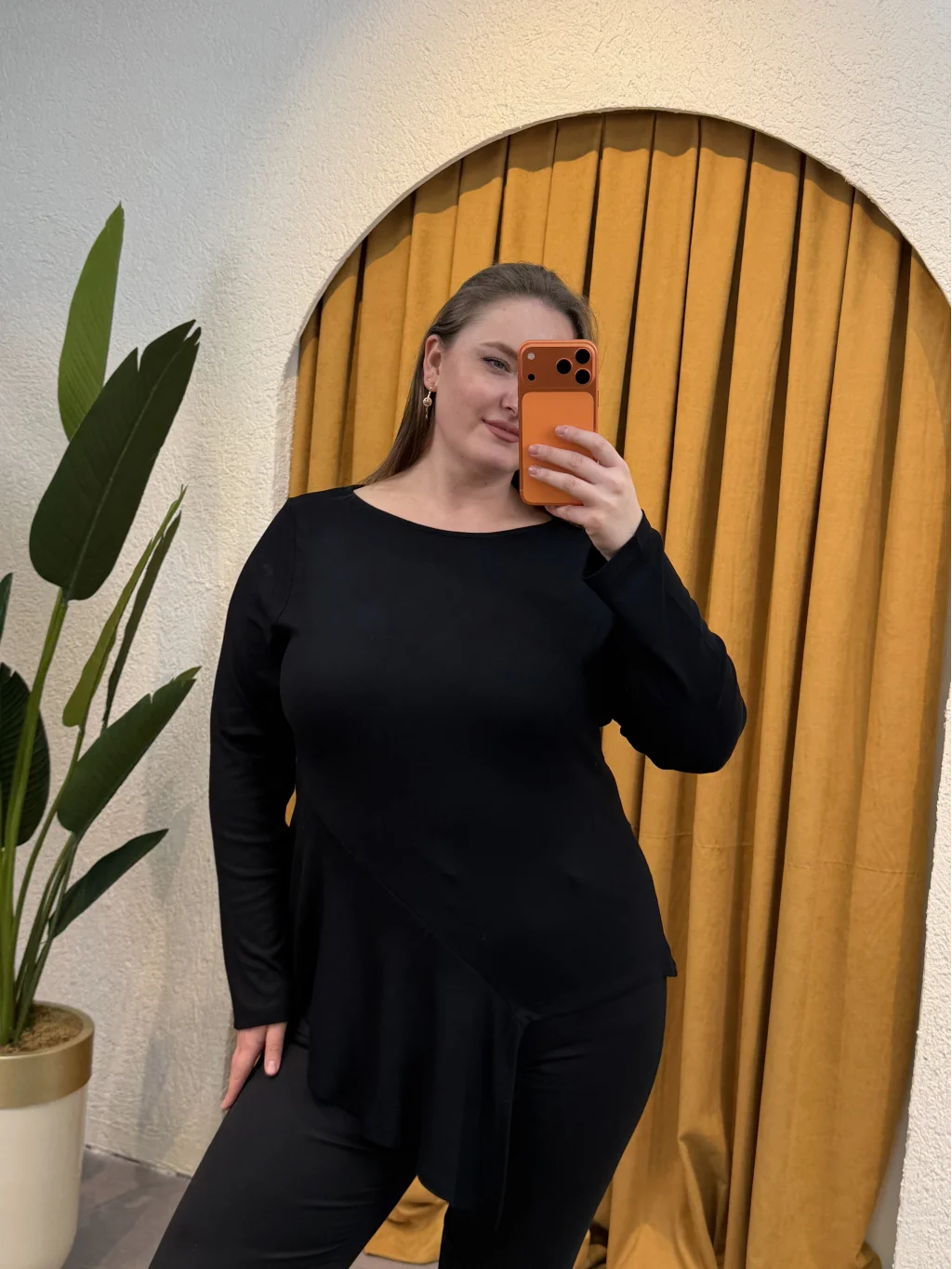 Pamuklu Yarım Asimetrik Esnek Penye Bluz - Siyah