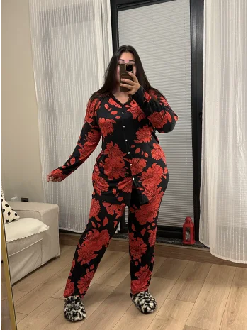 Dantel Detay Likralı Penye Pijama Takımı - Kırmızı Çiçekli