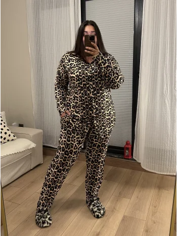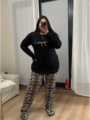 Premium Likralı Penye Pijama Takımı - Yoga Leopar