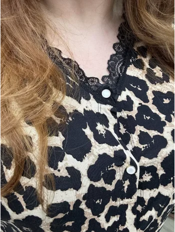 Dantel Detay Likralı Penye Pijama Takımı - Leopar