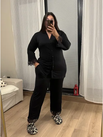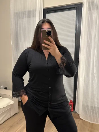 Dantel Detay Likralı Penye Pijama Takımı - Siyah