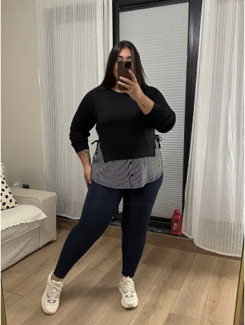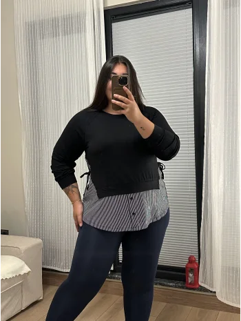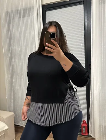 Garnili Yan Büzgü Esnek Penye Bluz - Çizgili