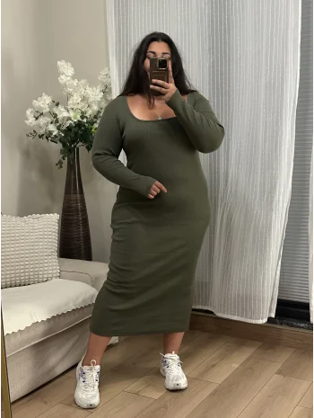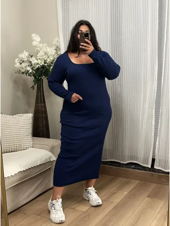Kare Yaka Triko Likralı Elbise - Lacivert