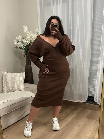 Kruvaze Yaka Esnek Triko Elbise - Kahverengi