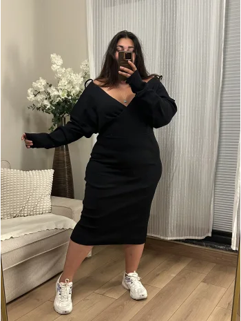 Kruvaze Yaka Esnek Triko Elbise - Siyah