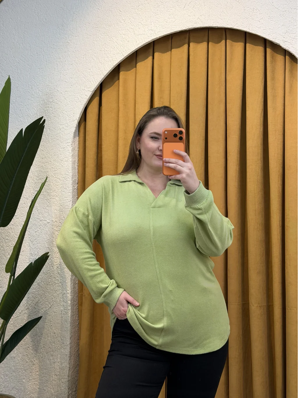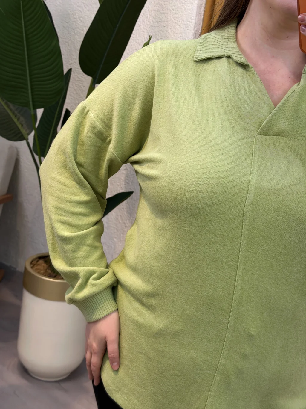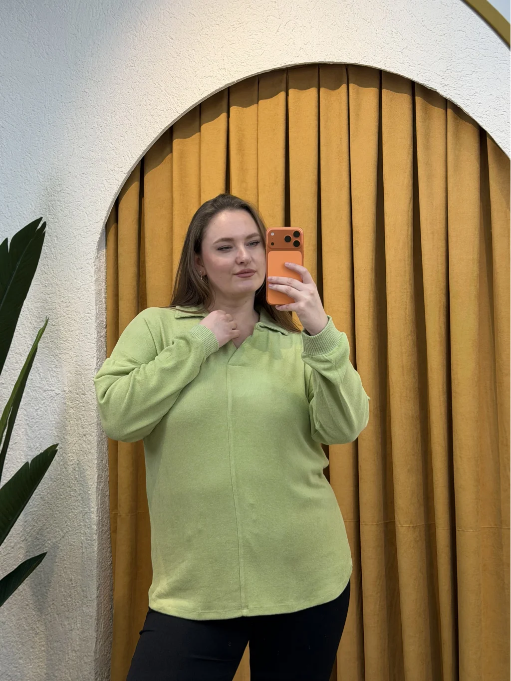 Polo Yaka Esnek Yumoş Bluz - Yeşil