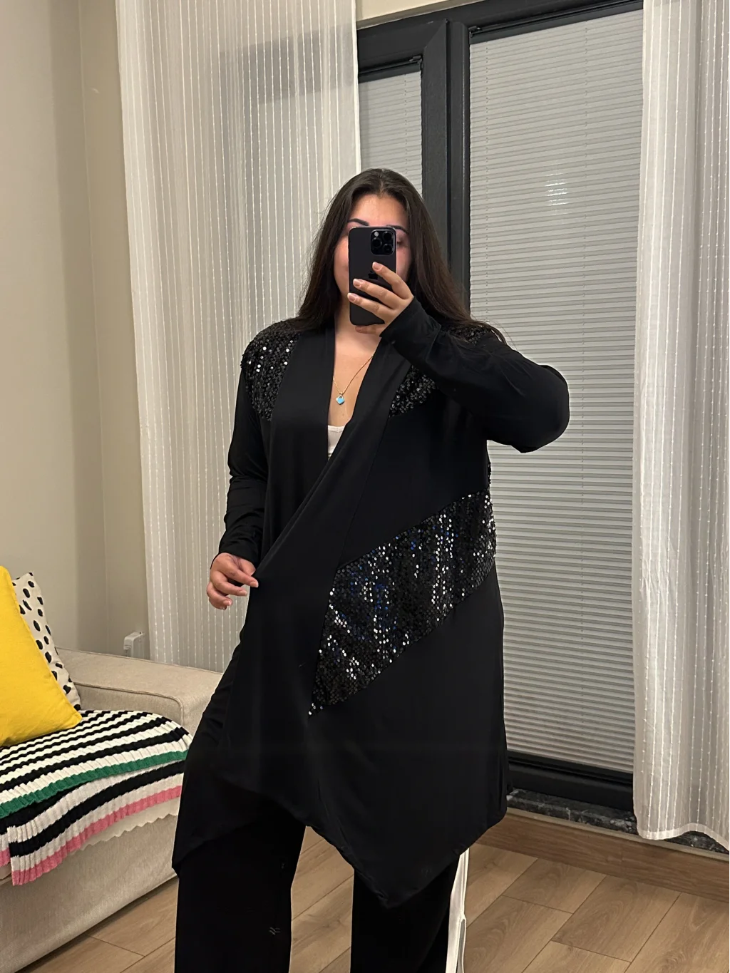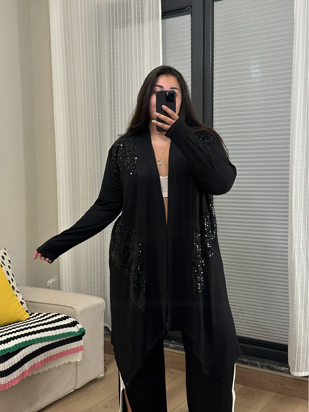 PASTEL Pul Payet Esnek Uzun Hırka, büyük beden kadın hırka arayanlar için ideal bir seçenektir.