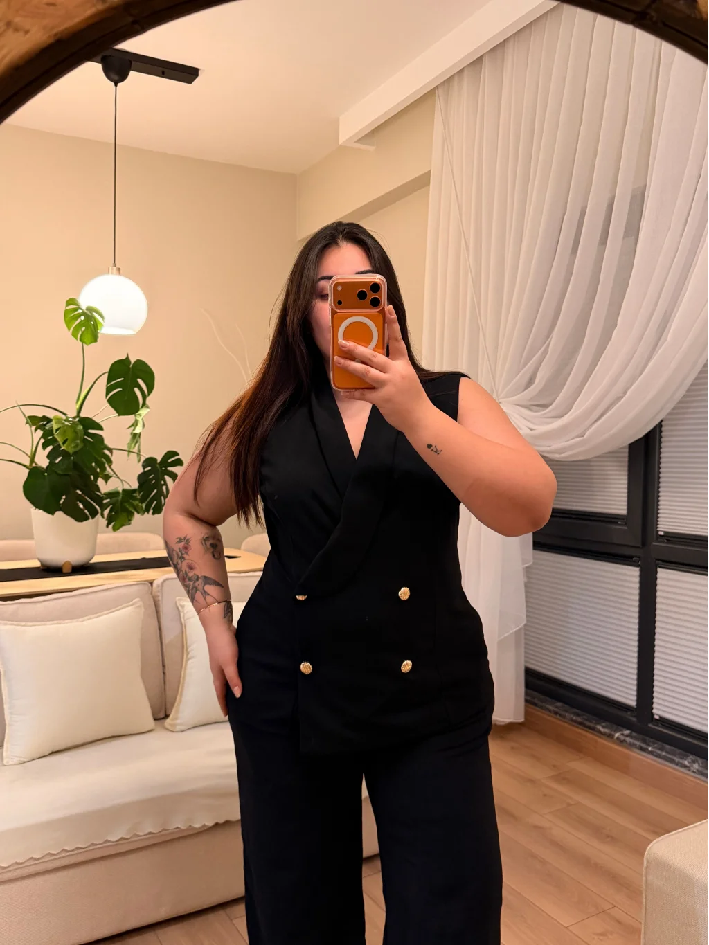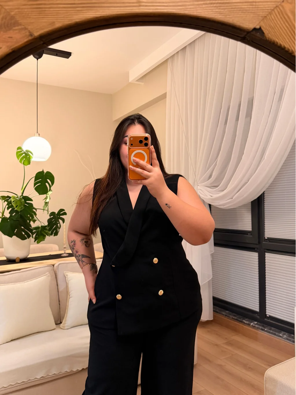 Sıfır Kol Düğme Detaylı Krep Takım - Siyah