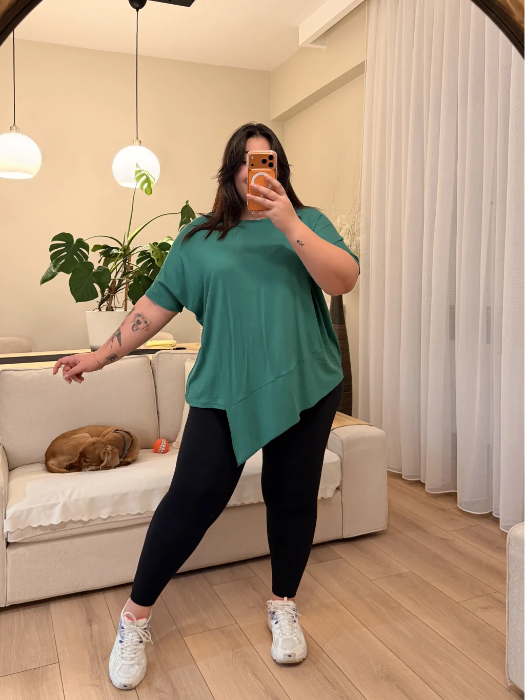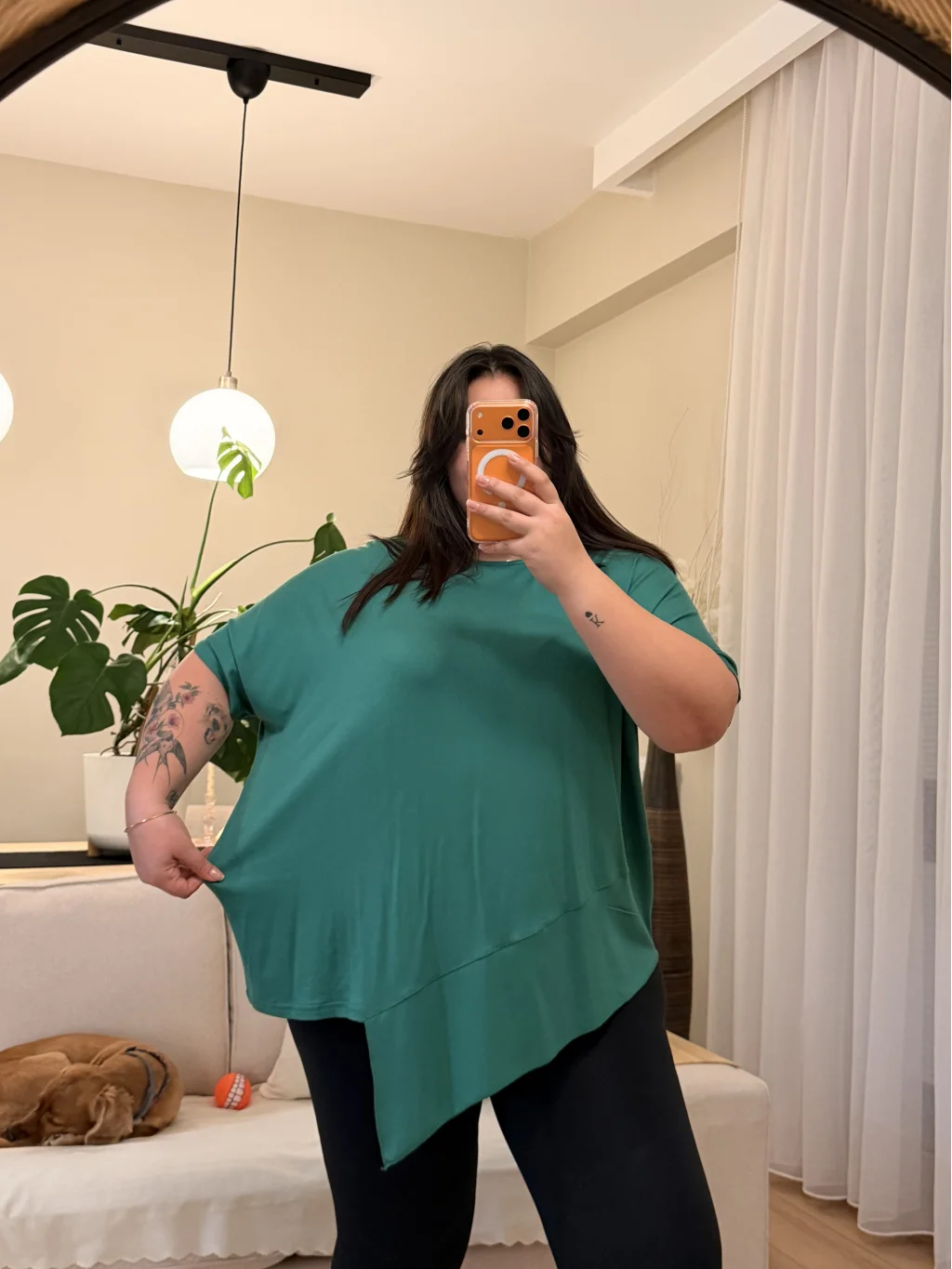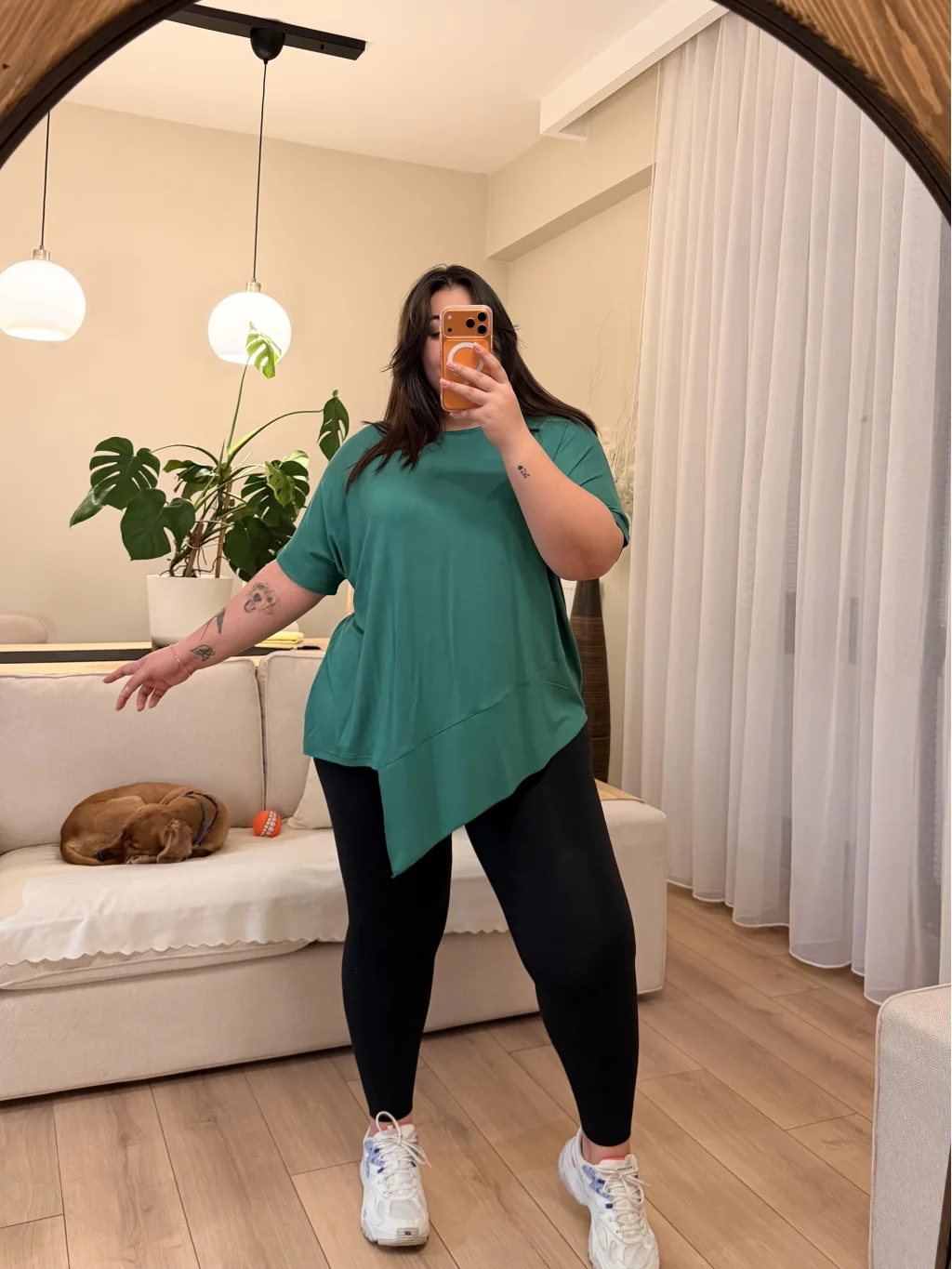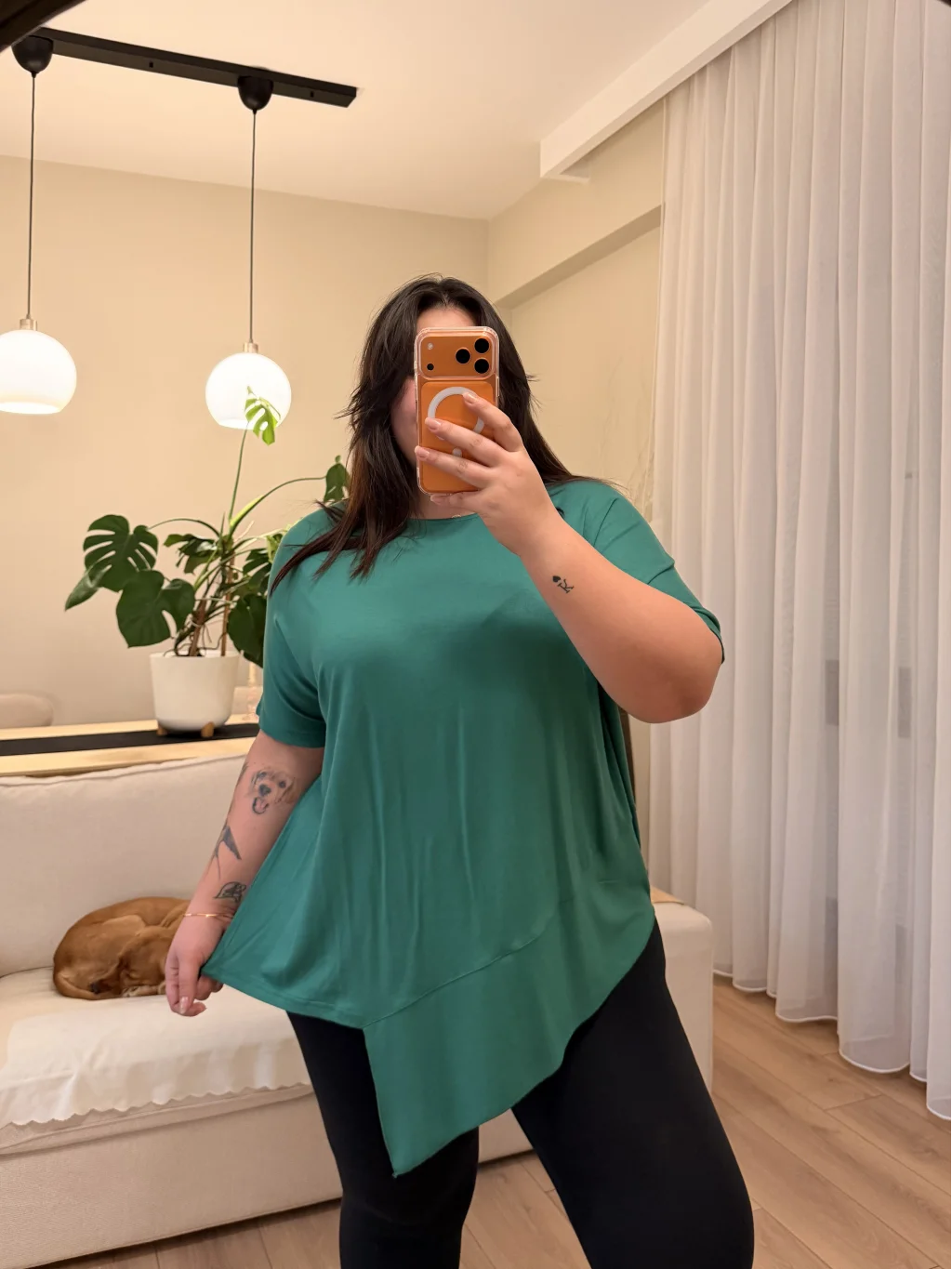 PASTEL BUTİK Zümrüt Yeşili Simetri Detaylı Basic Esnek Penye Tişört, şıklığı ve rahatlığı bir arada sunar.