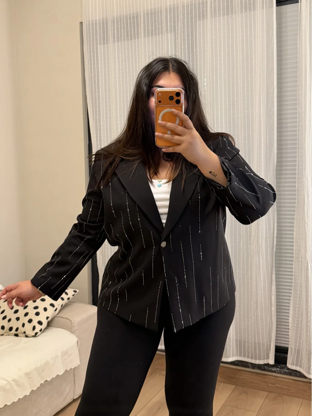 Taş Detaylı Premium Astarlı Blazer Ceket - Siyah