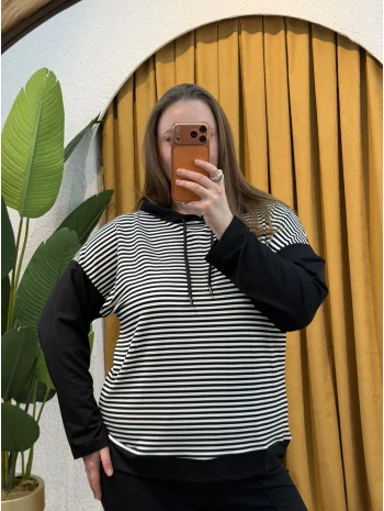 Kapüşonlu Çizgili Sweatshirt - Siyah