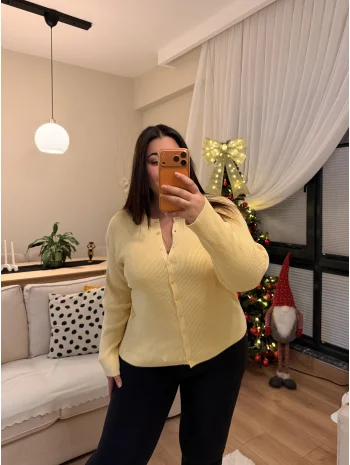 Premium Çizgili Düğmeli Triko Hırka - Sarı