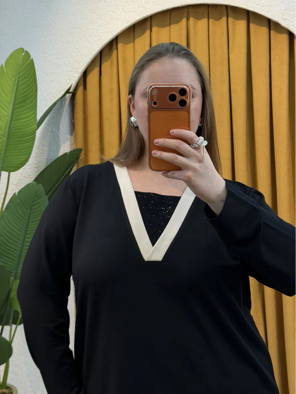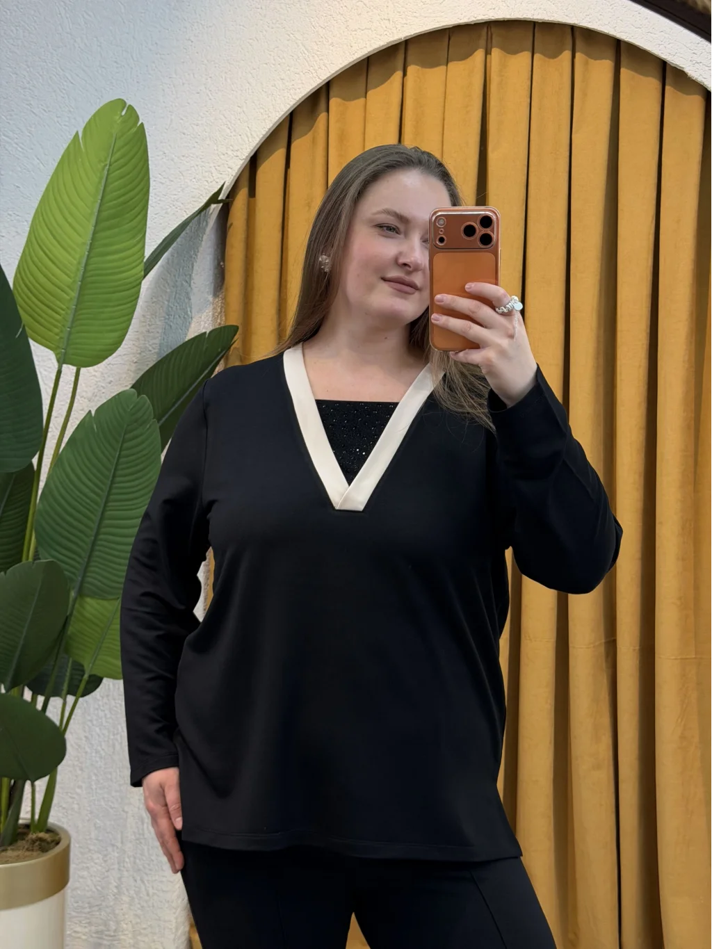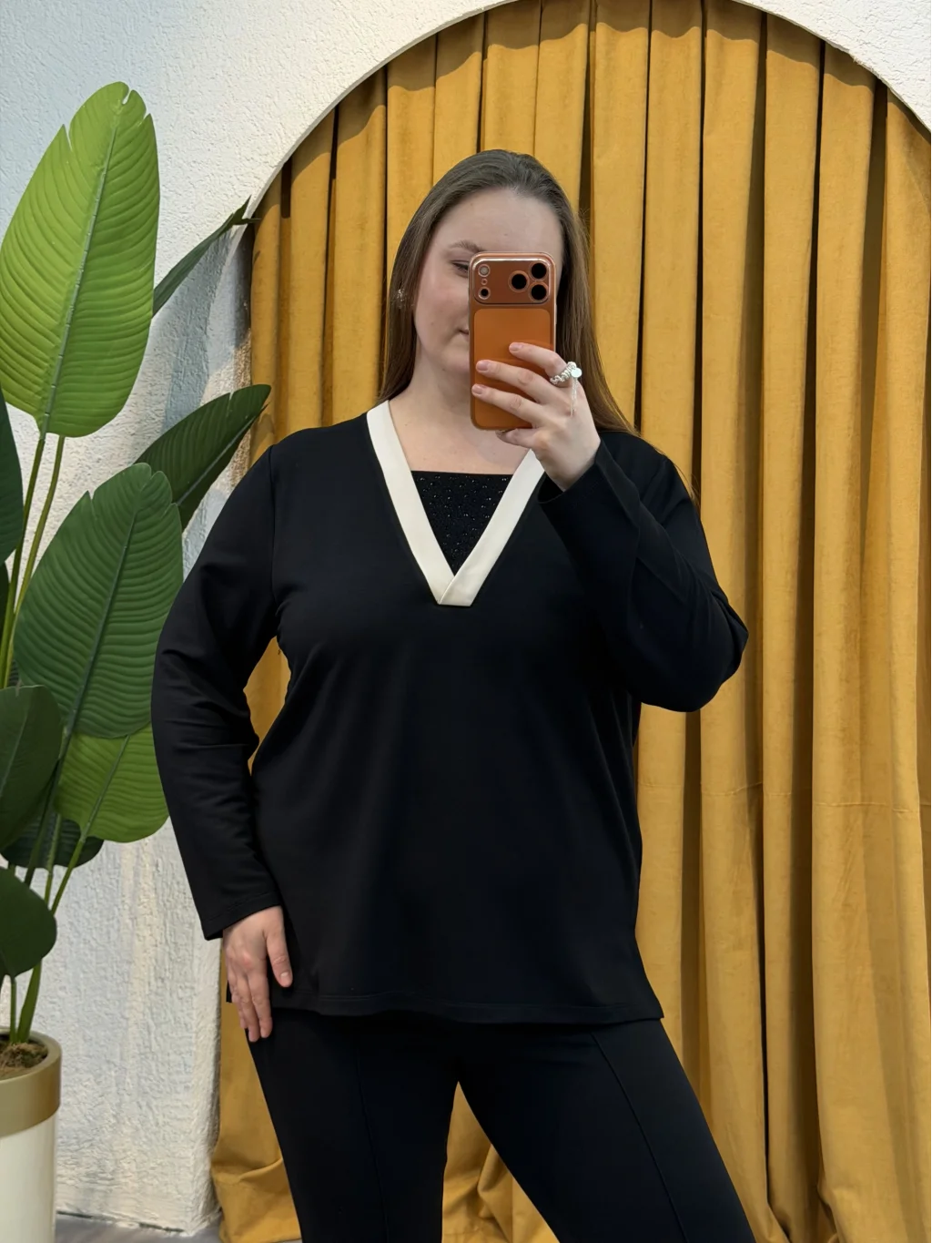 V Yaka Çift Renkli Taşlı Bluz - Siyah